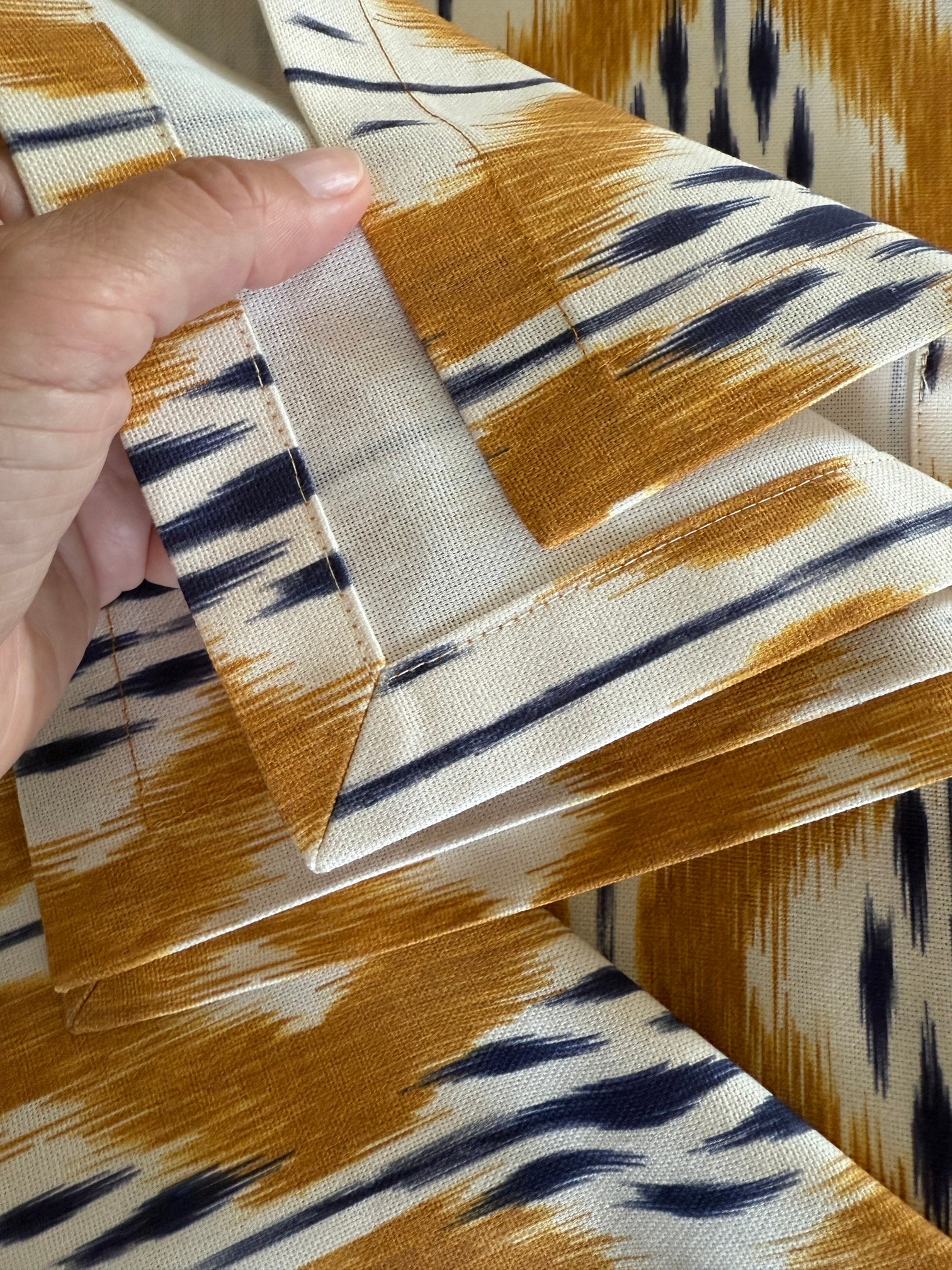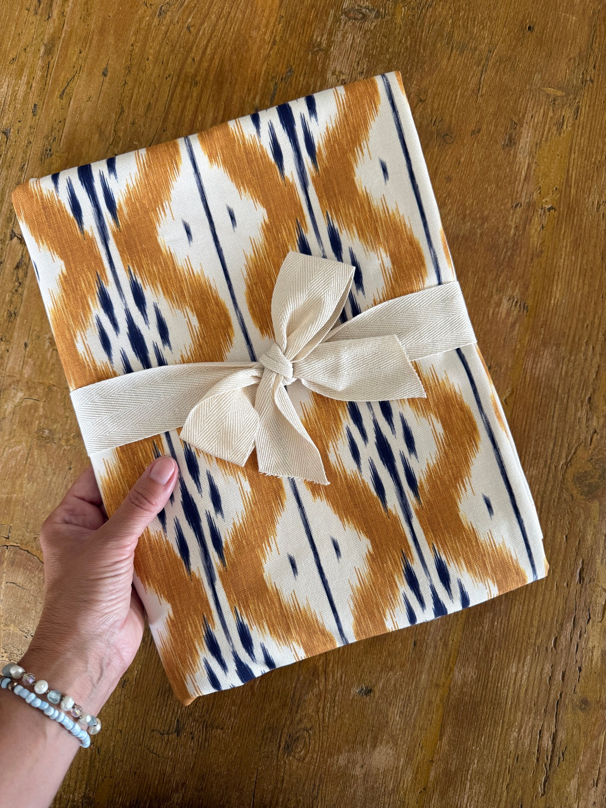 El mantel Tivra está confeccionado en algodón 100 %, con un estampado tipo ikat en tonos mostaza, azul marino y crema. Su diseño aporta carácter, color y un aire bohemio a cualquier ambiente. Perfecto para mesas con alma natural, espacios creativos o celebraciones con personalidad.