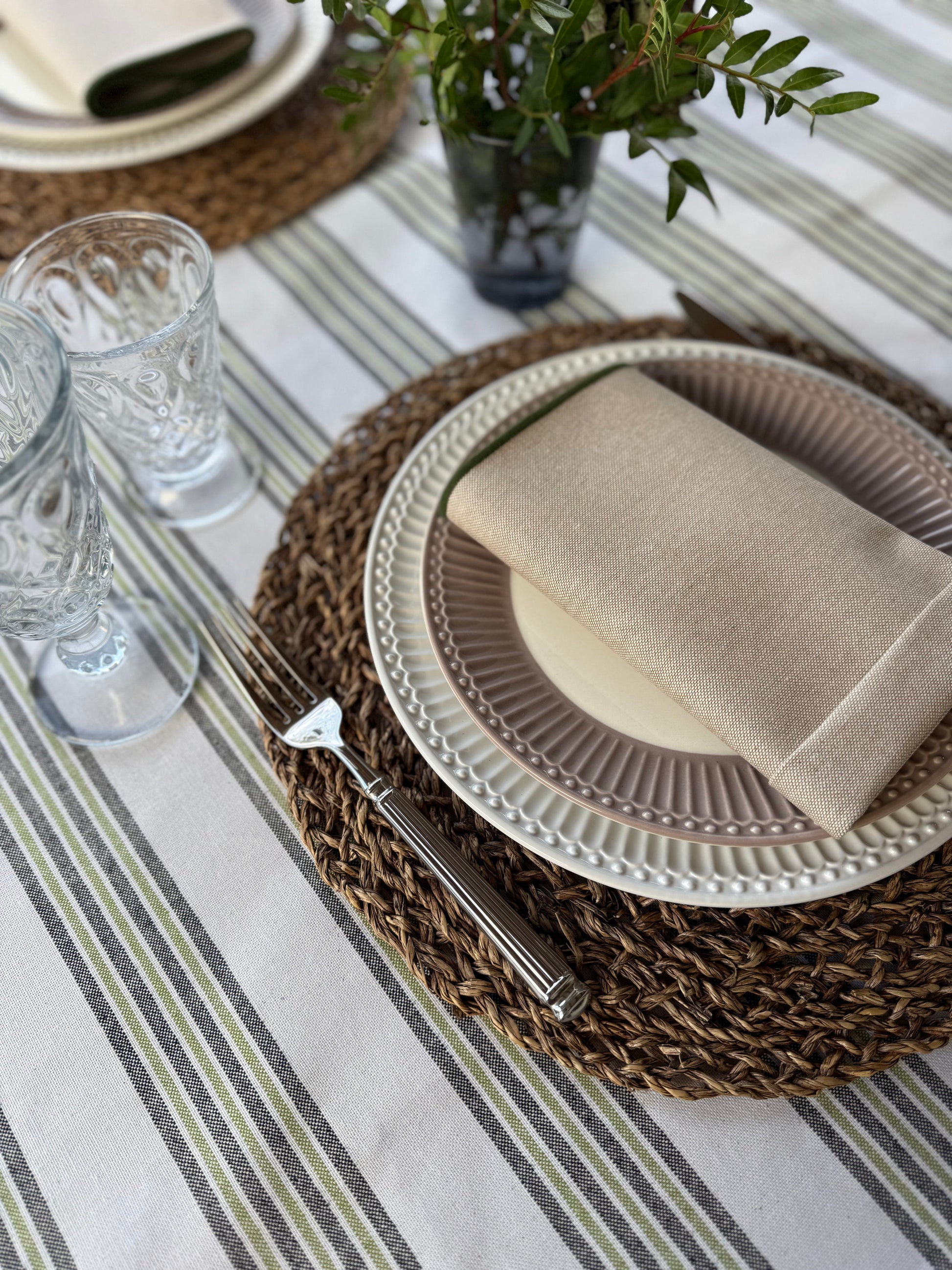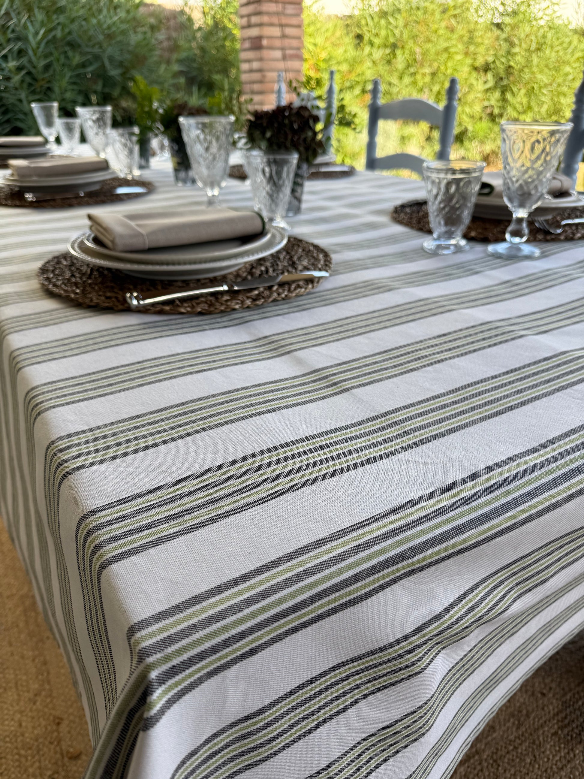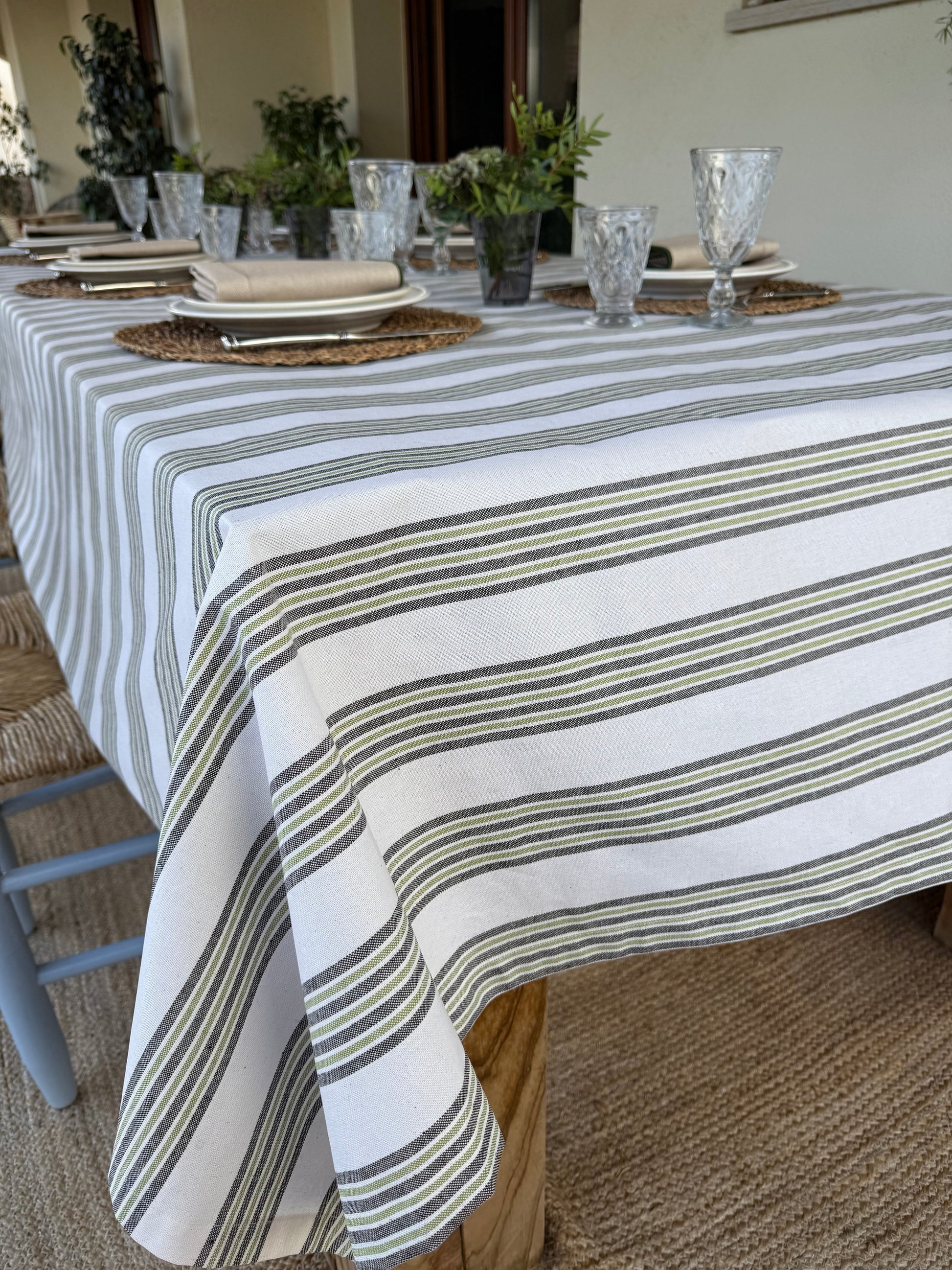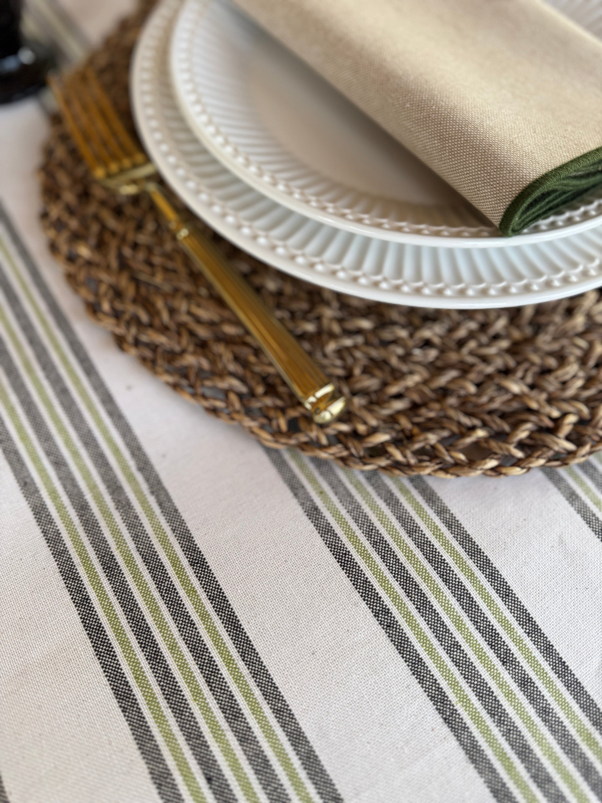Su estampado de rayas en tonos verdes y neutros aporta calma, frescura y un aire acogedor a cualquier mesa. Ideal para comidas familiares, celebraciones al aire libre o cenas especiales.