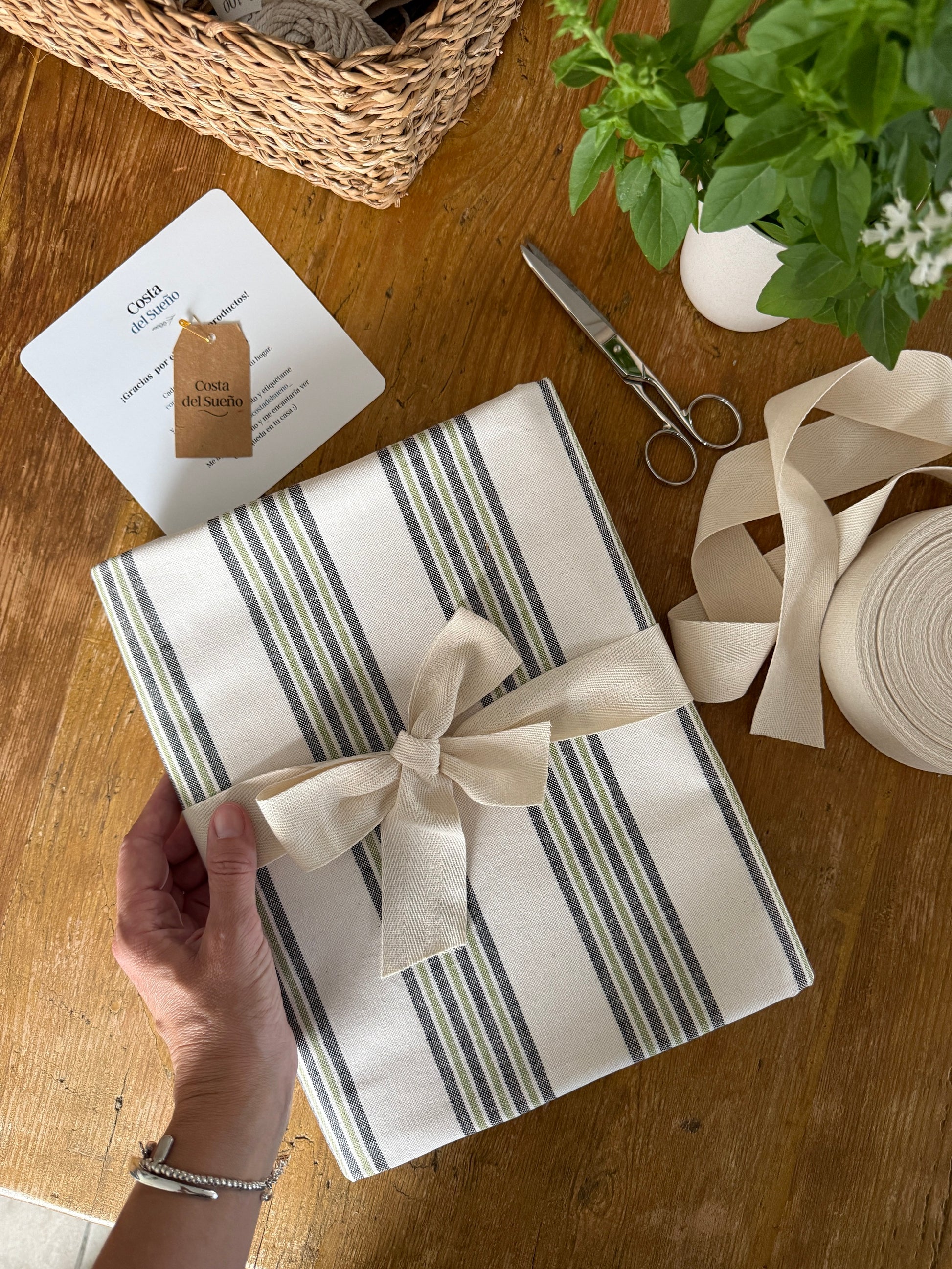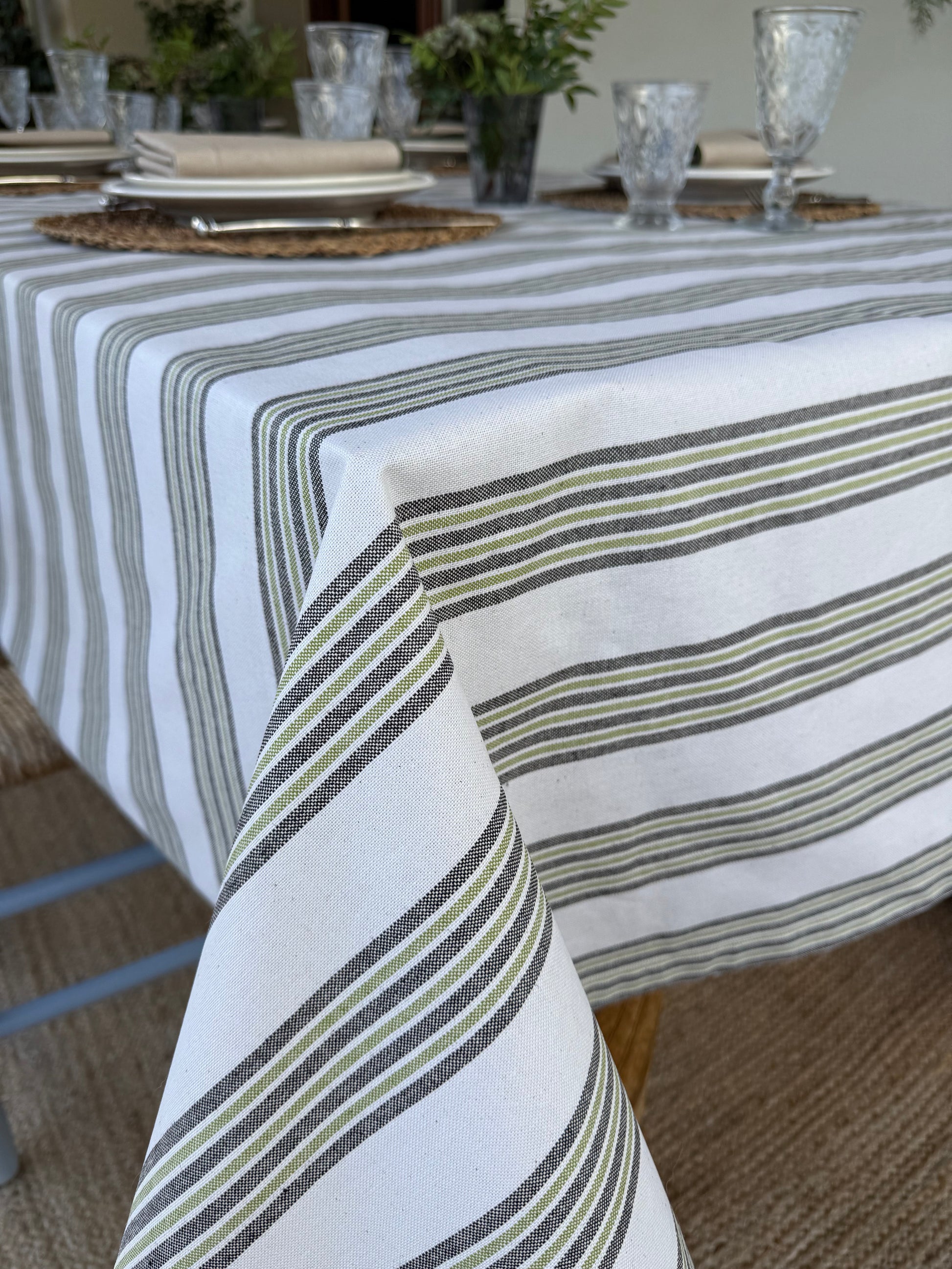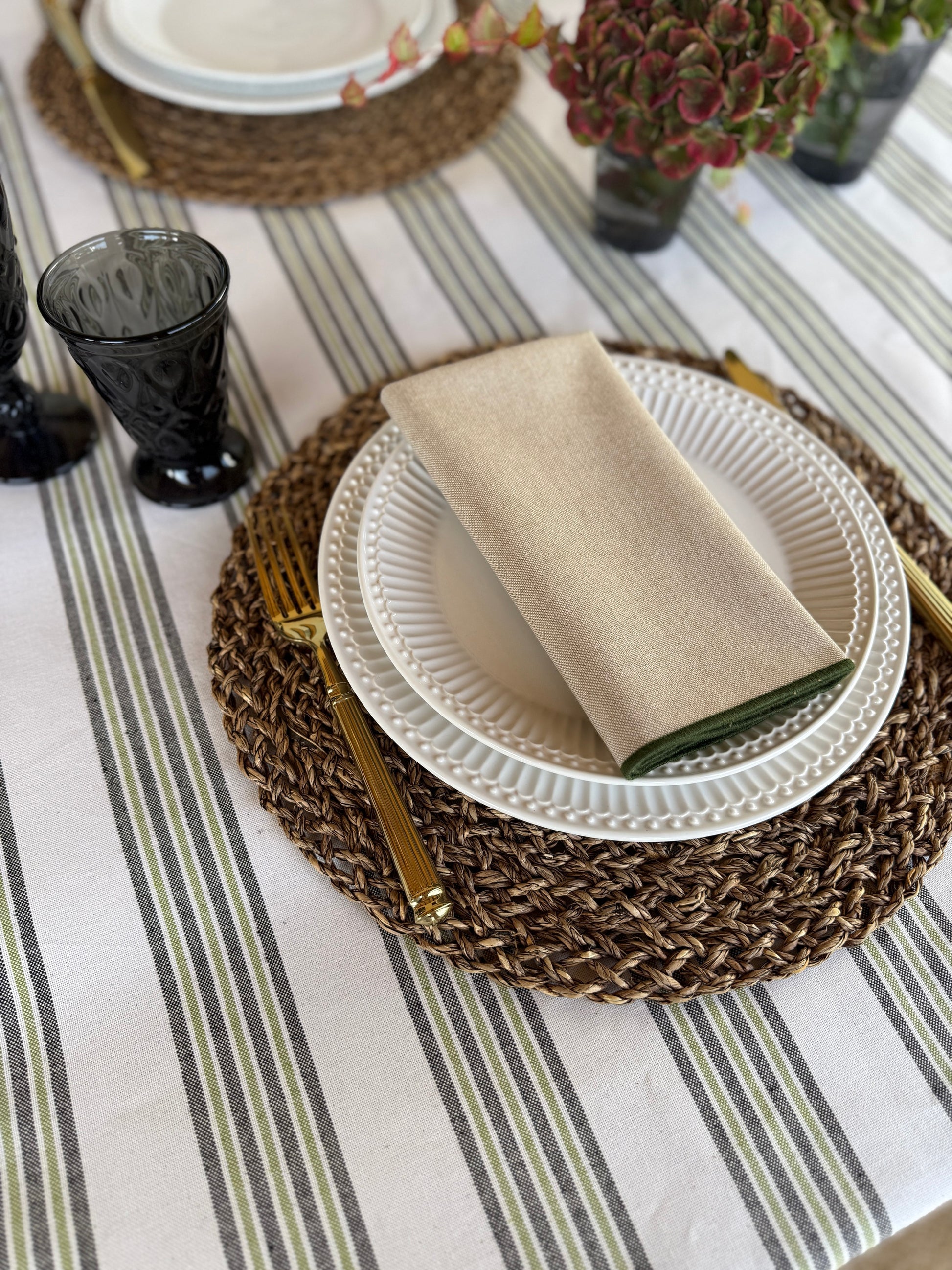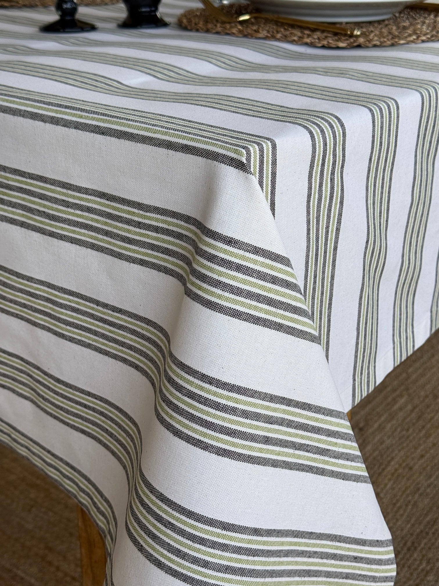Su estampado de rayas en tonos verdes y neutros aporta calma, frescura y un aire acogedor a cualquier mesa. Ideal para comidas familiares, celebraciones al aire libre o cenas especiales.