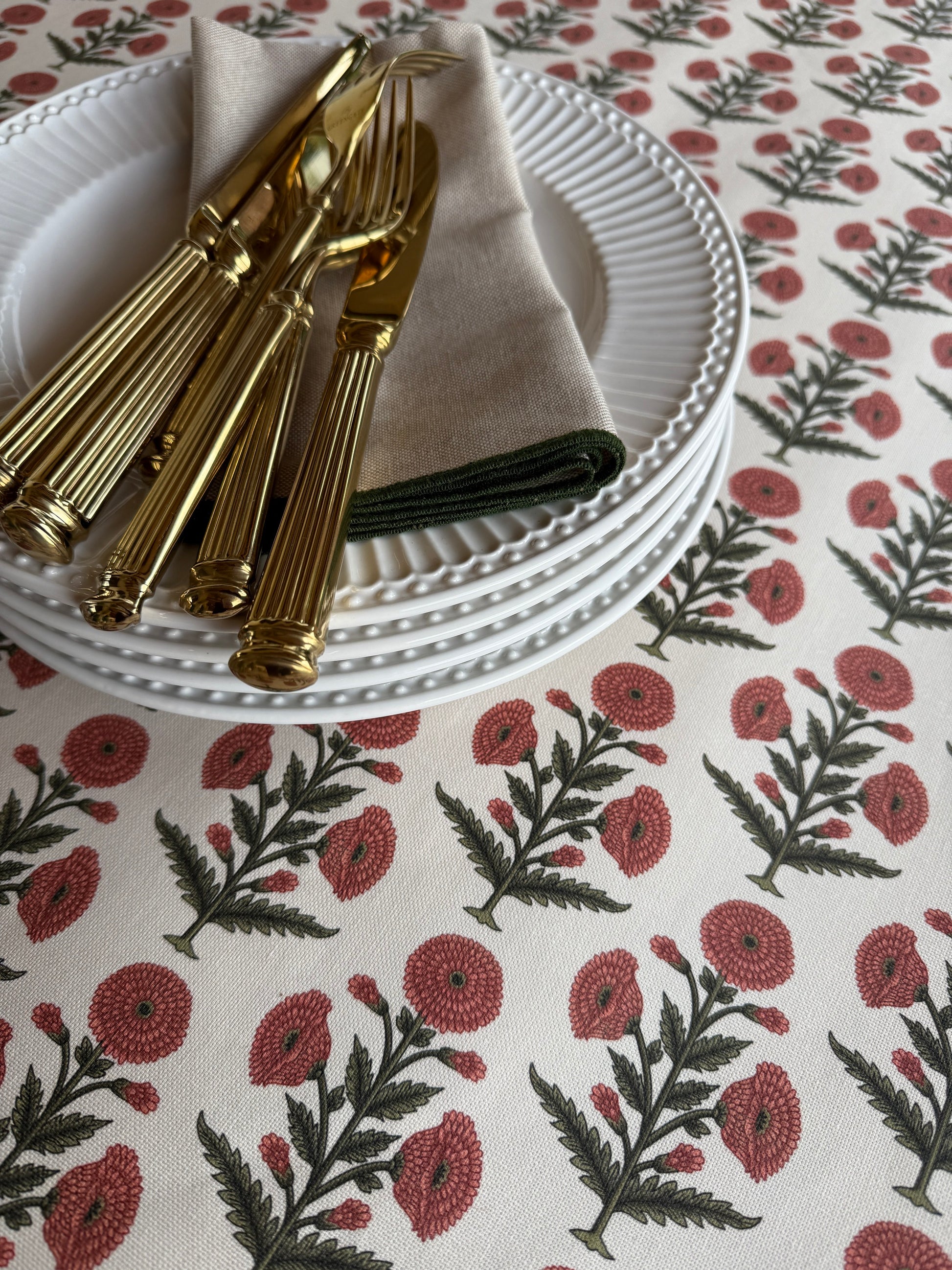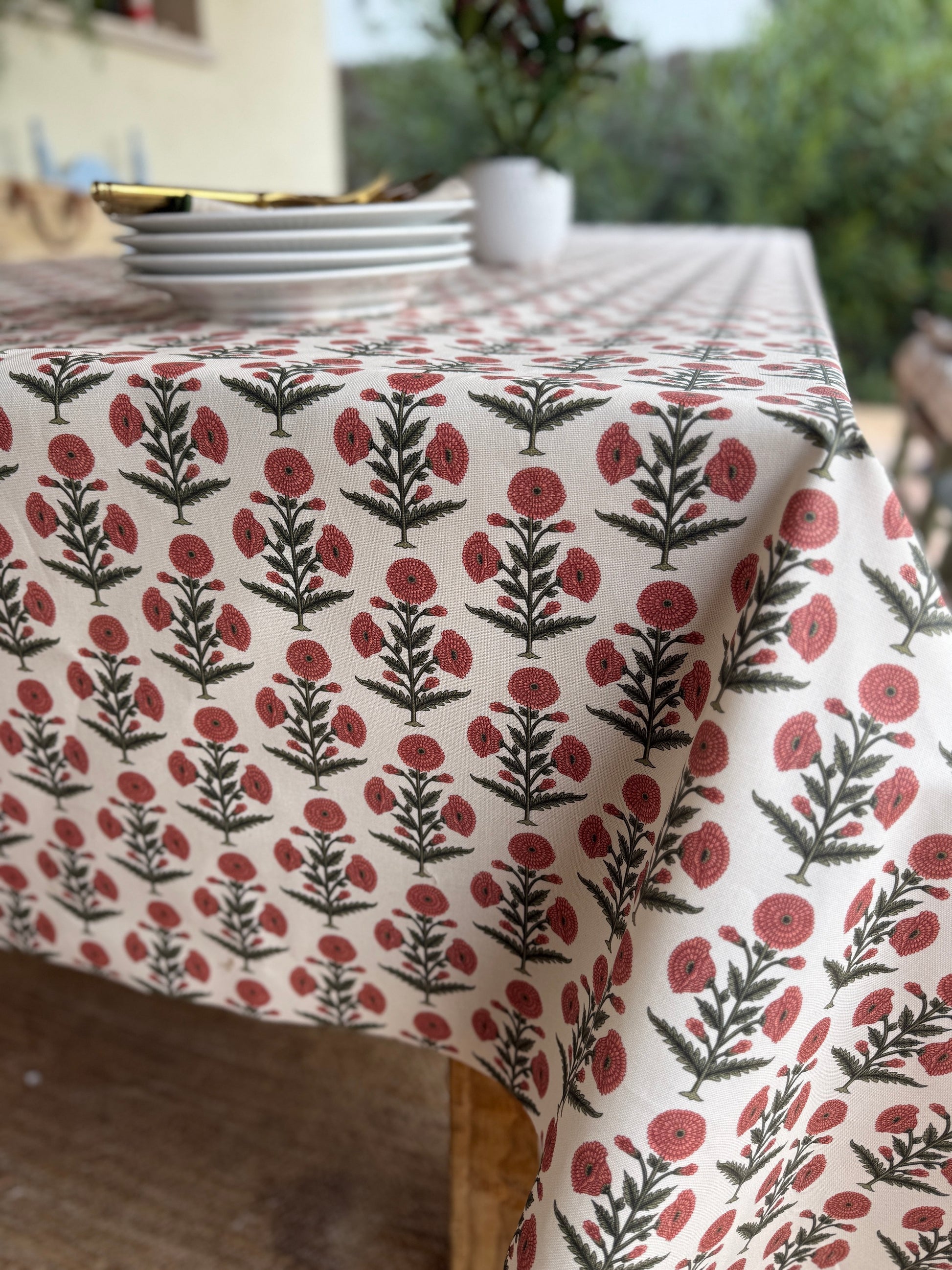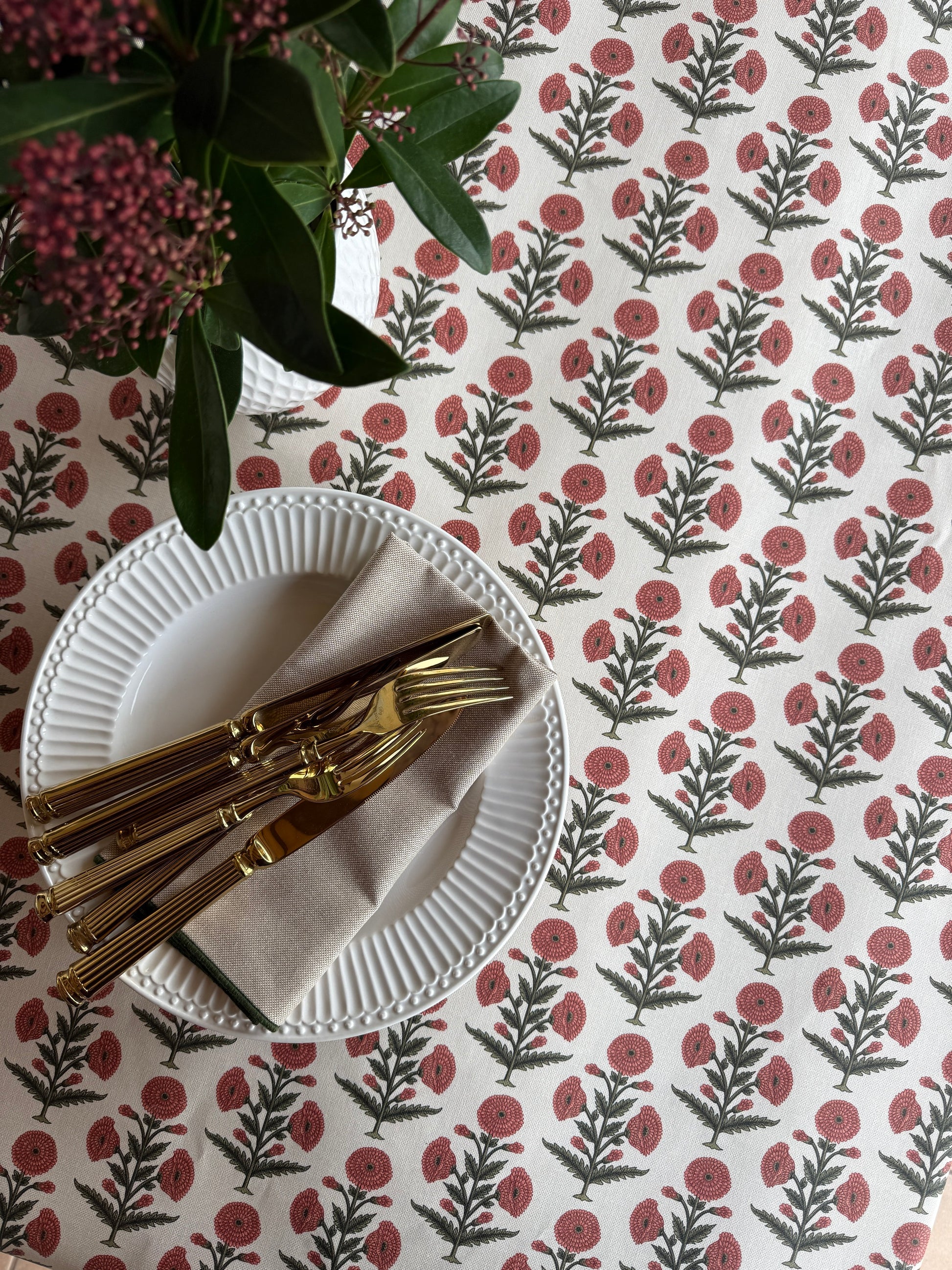 Casilda es un mantel de algodón con un estampado floral cálido y delicado, perfecto para dar vida a cualquier mesa.