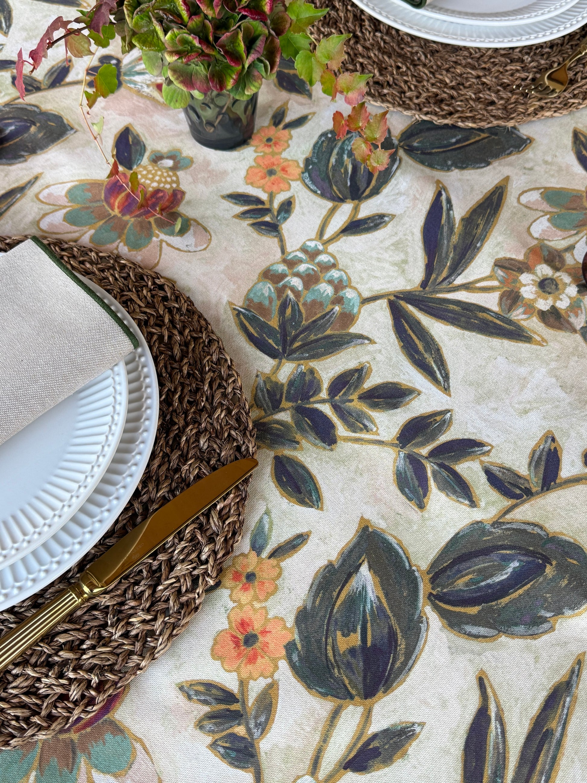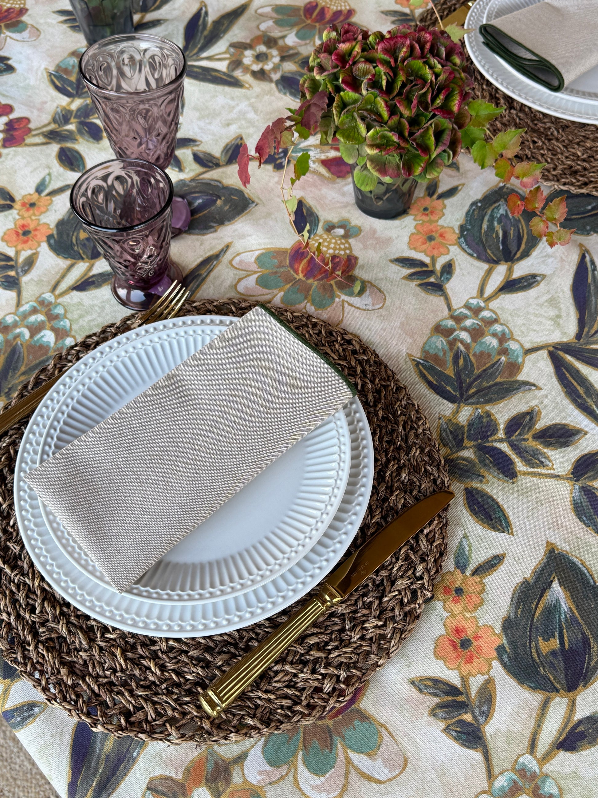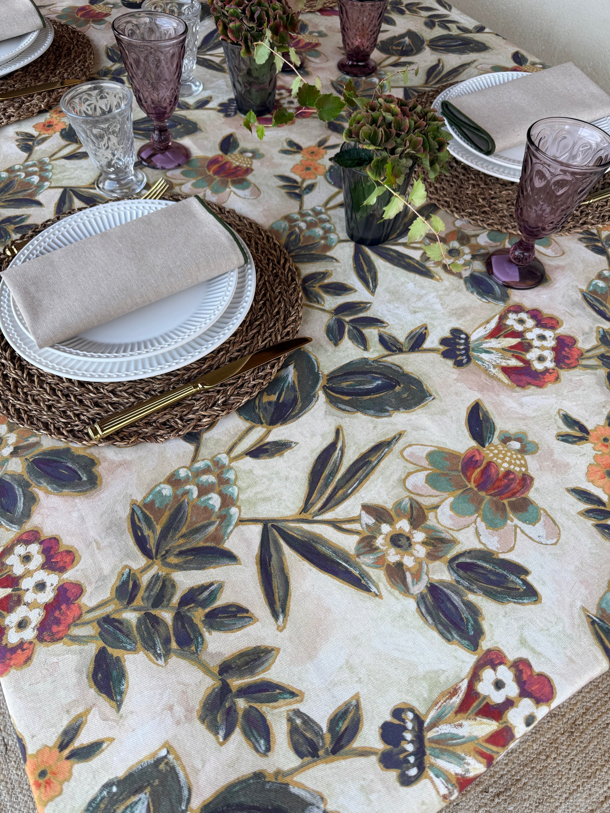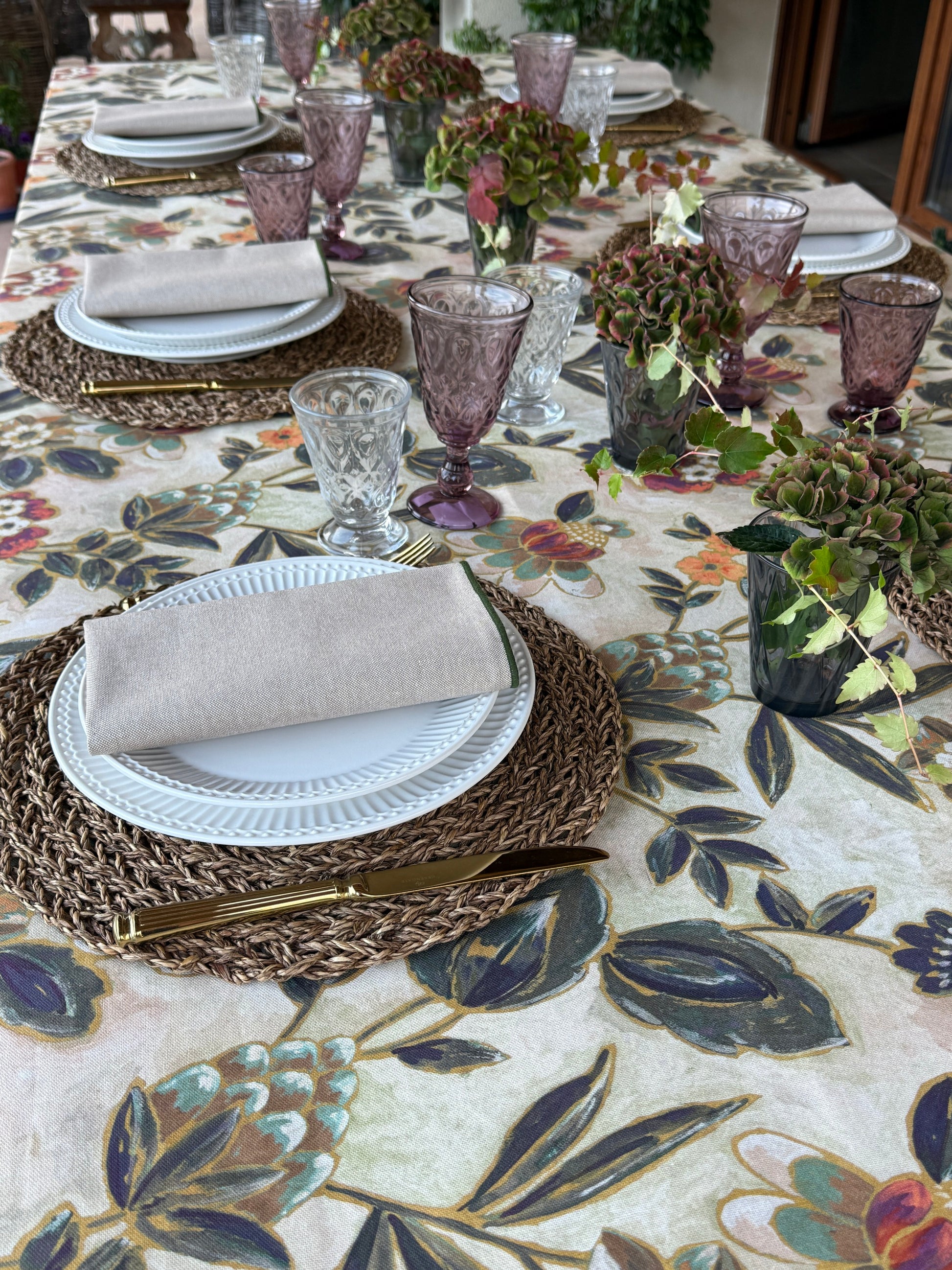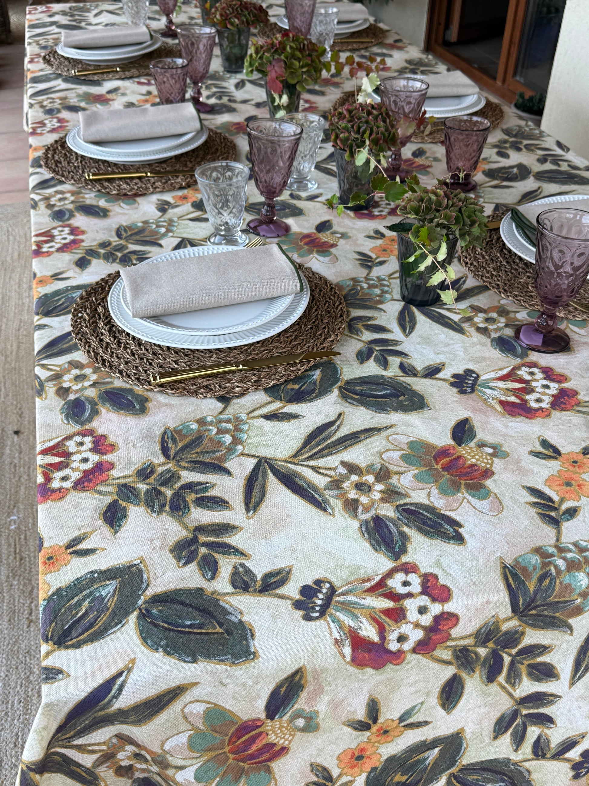 Celesta es un mantel de algodón con un estampado floral lleno de carácter y armonía. Sus tonos suaves y toques profundos evocan la sensación de una comida lenta, de sobremesas largas y momentos compartidos.