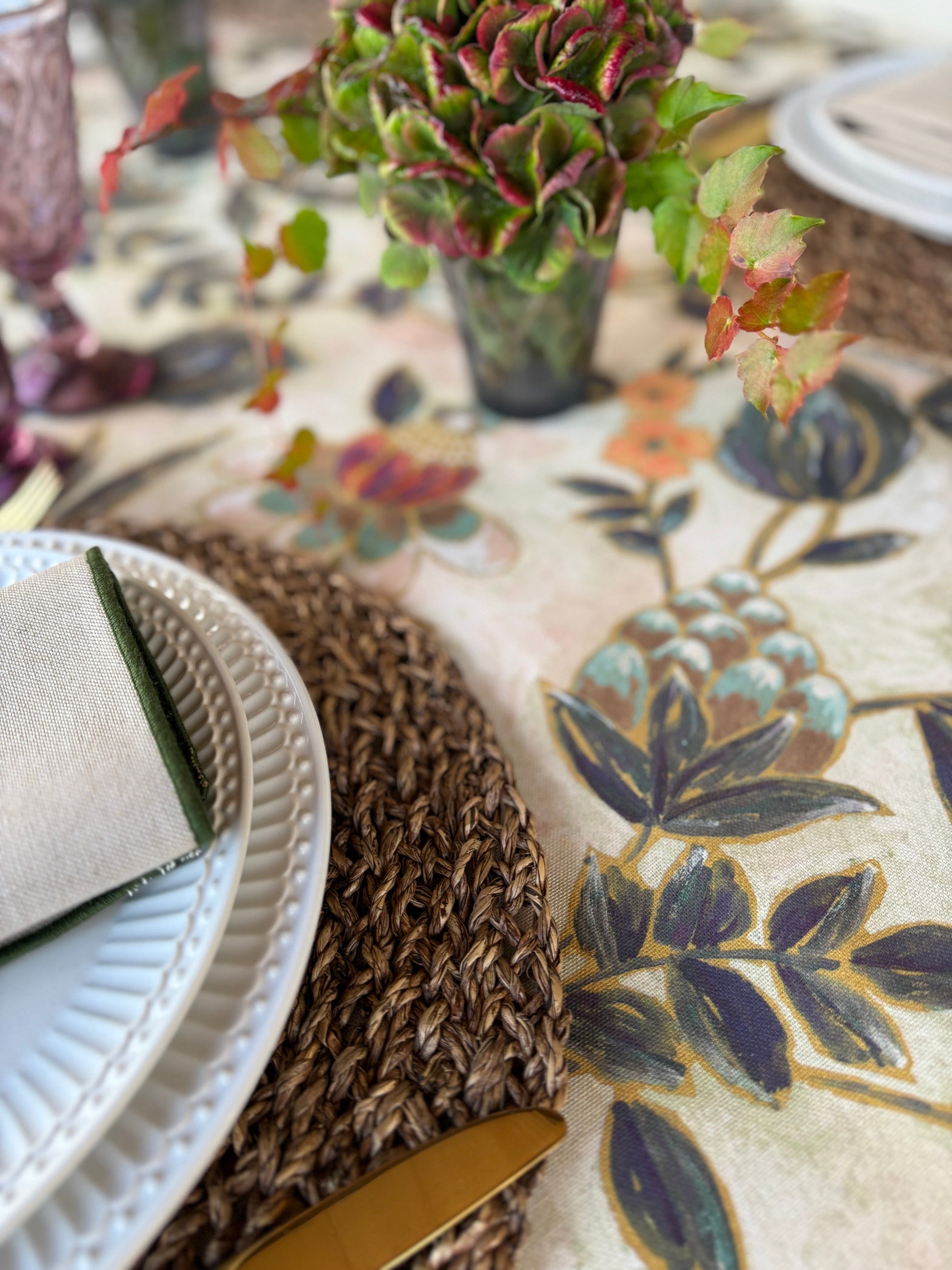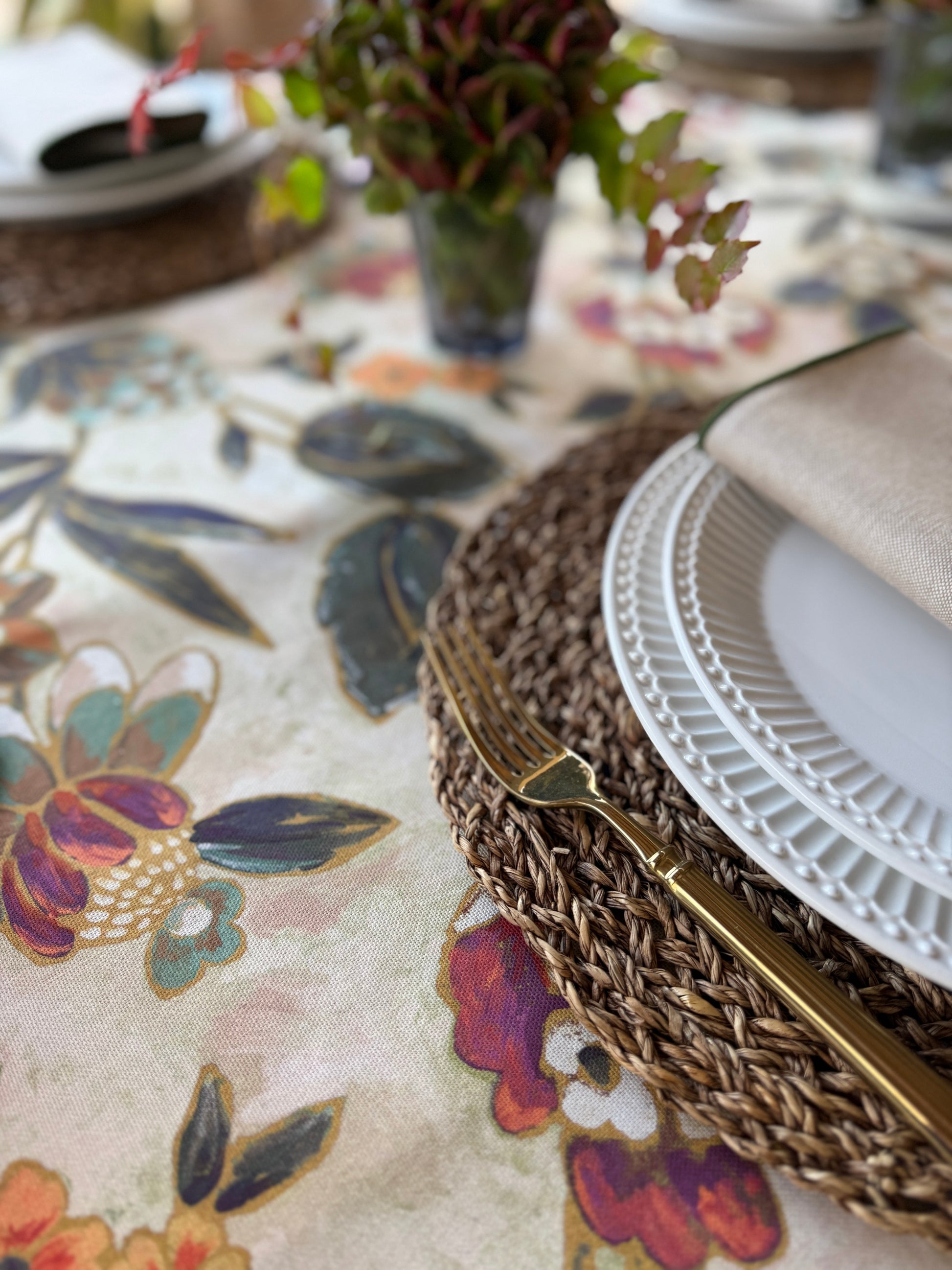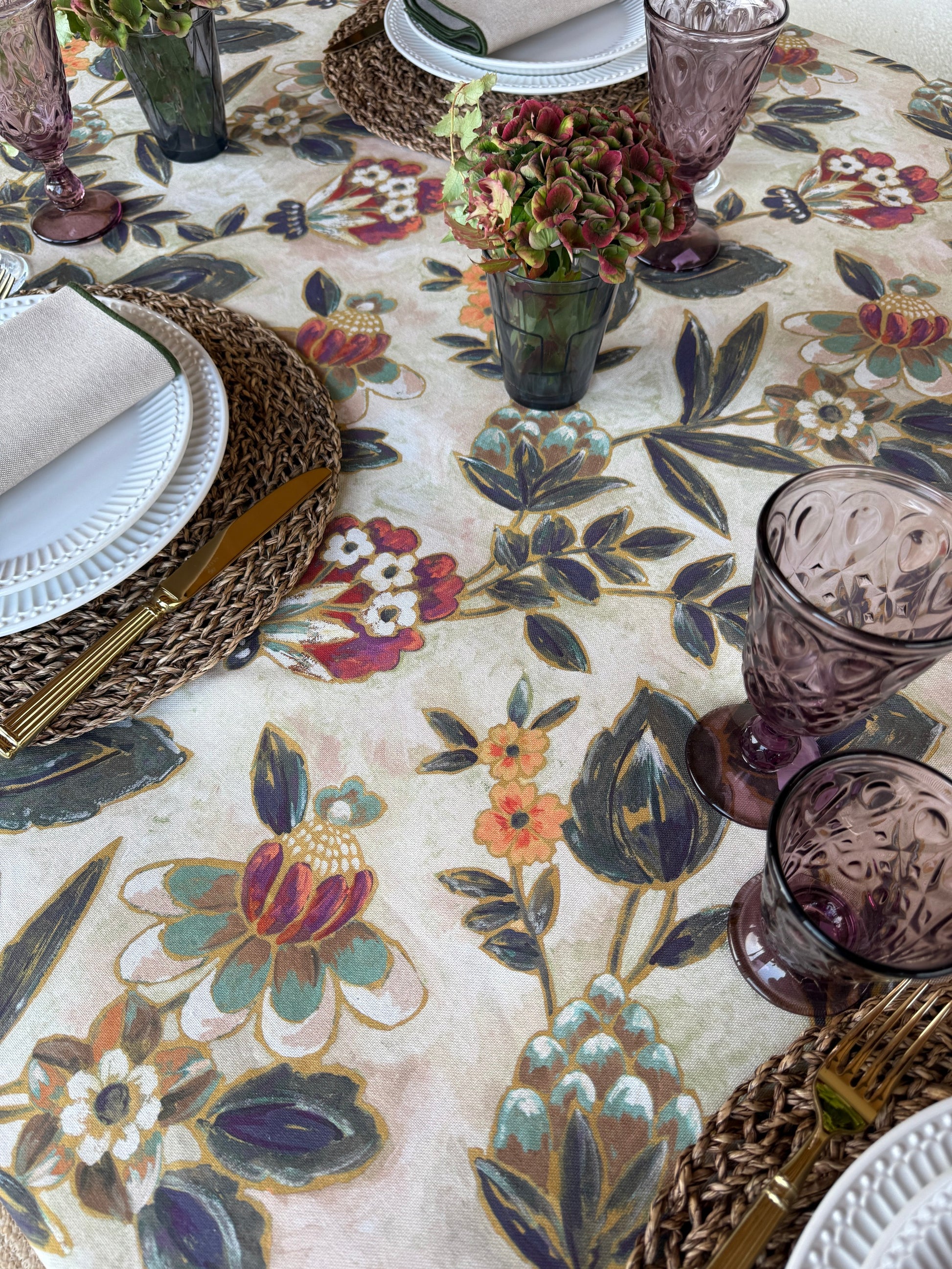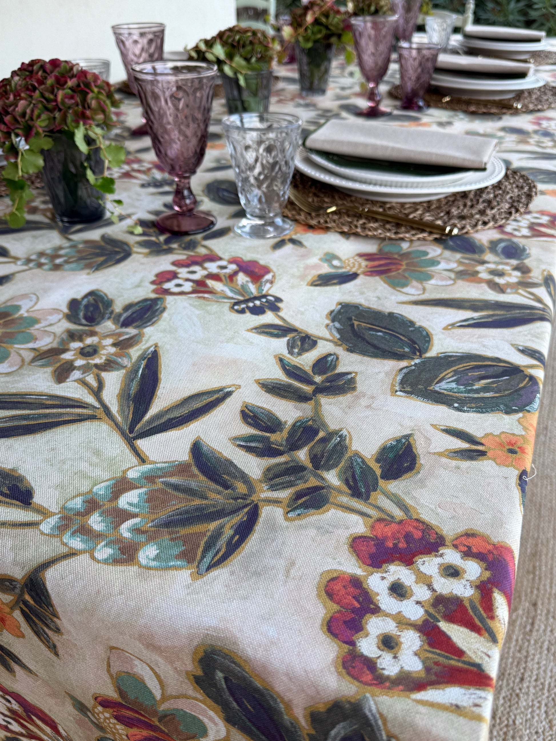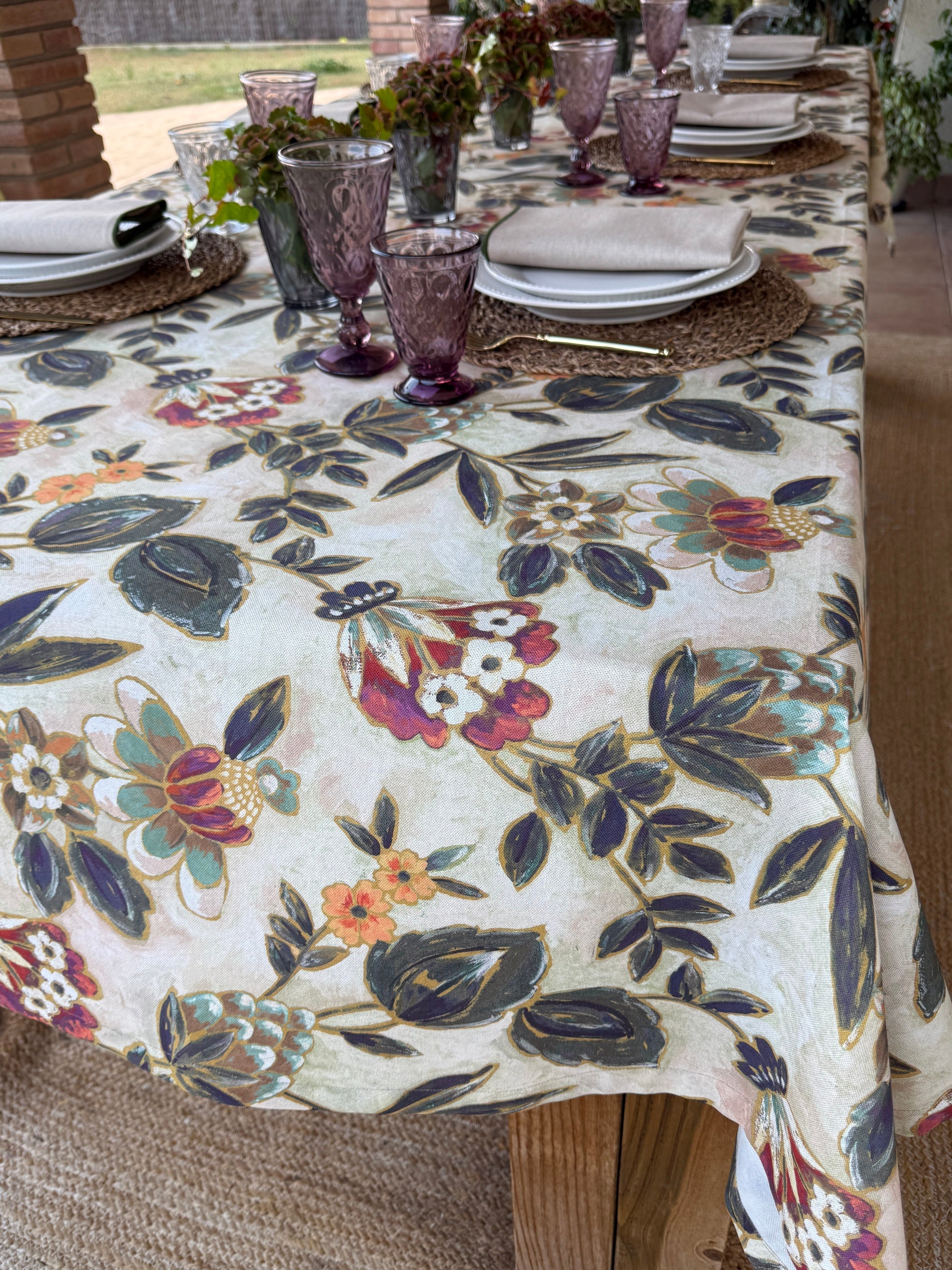Celesta es un mantel de algodón con un estampado floral lleno de carácter y armonía. Sus tonos suaves y toques profundos evocan la sensación de una comida lenta, de sobremesas largas y momentos compartidos.