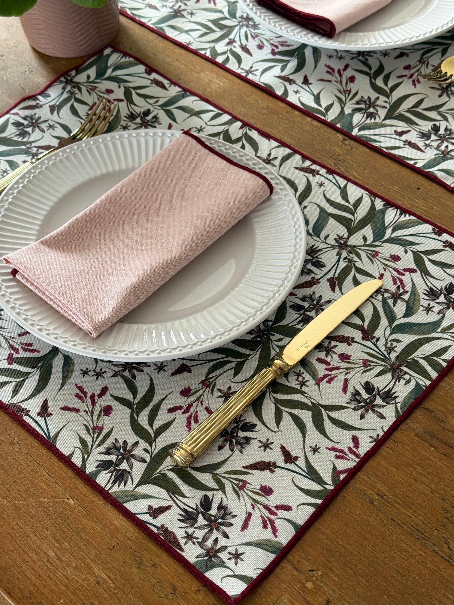 Individual de algodón orgánico resinado (antimanchas) con estampado Lucía y ribete granate