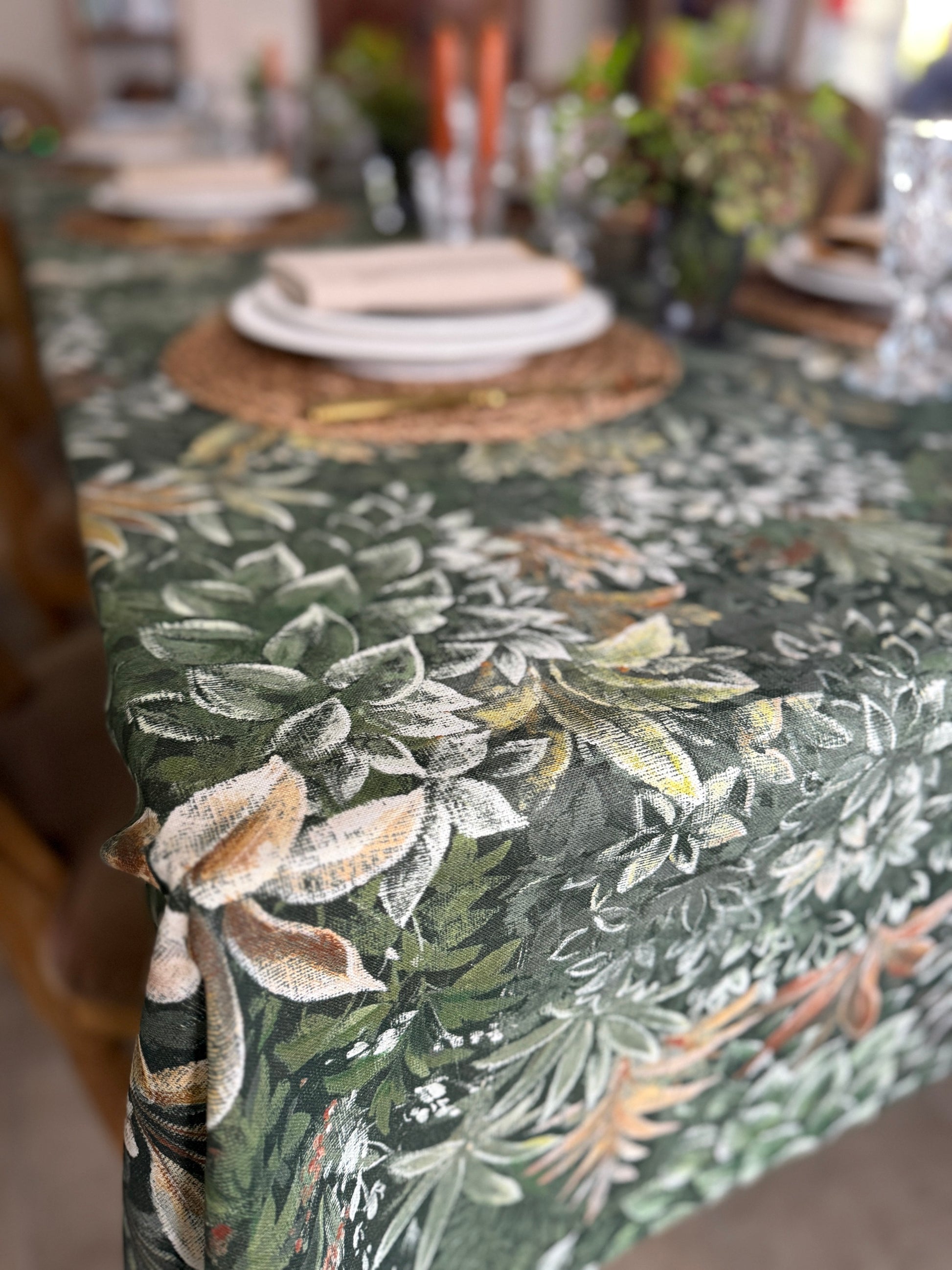 Su estampado floral con tonos naturales sobre un fondo verde profundo crea una atmósfera cálida y elegante - perfecta para Navidad, cenas de invierno o cualquier celebración en casa.