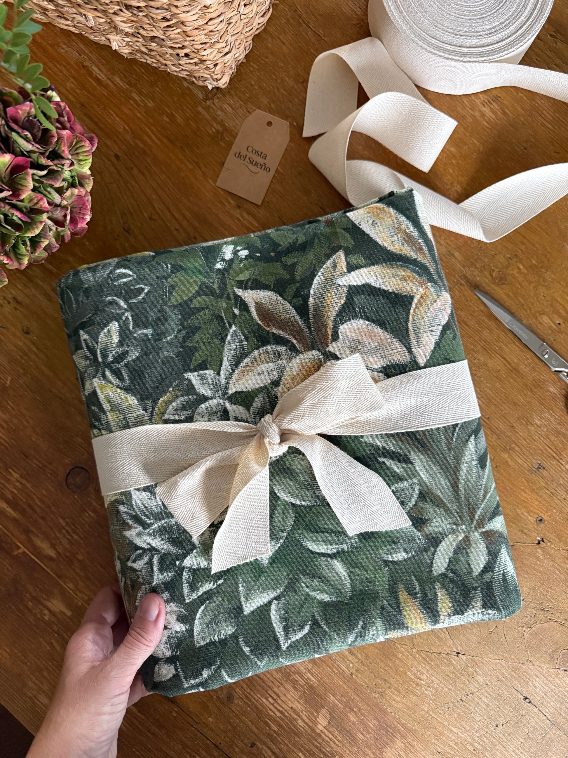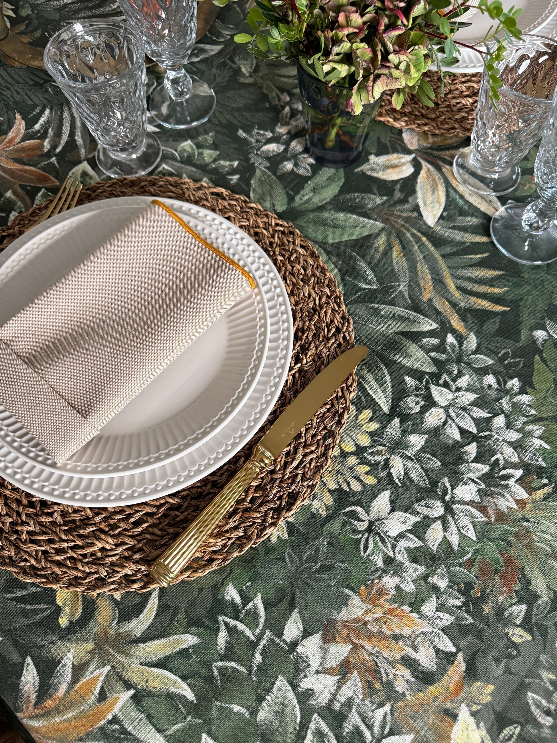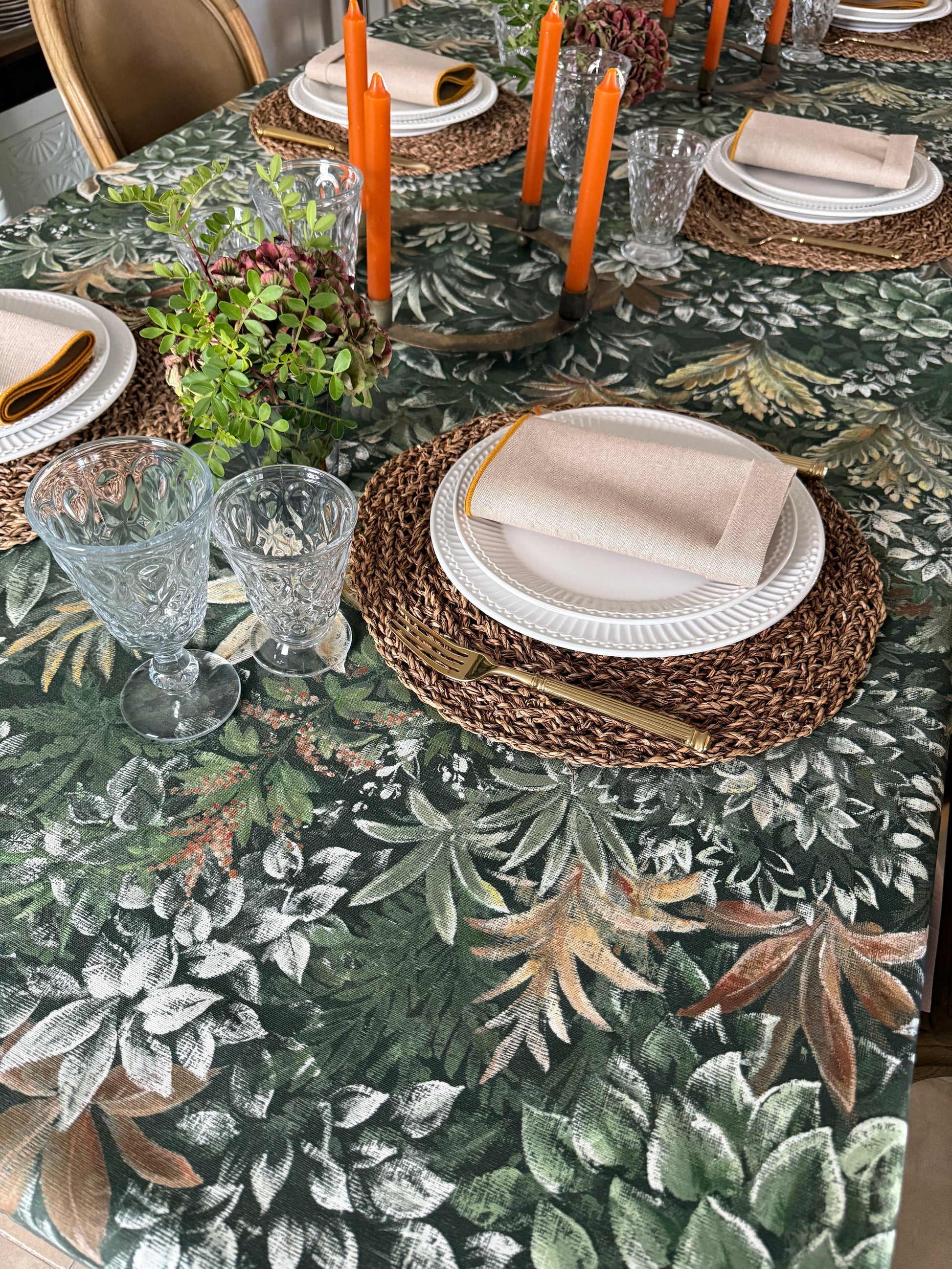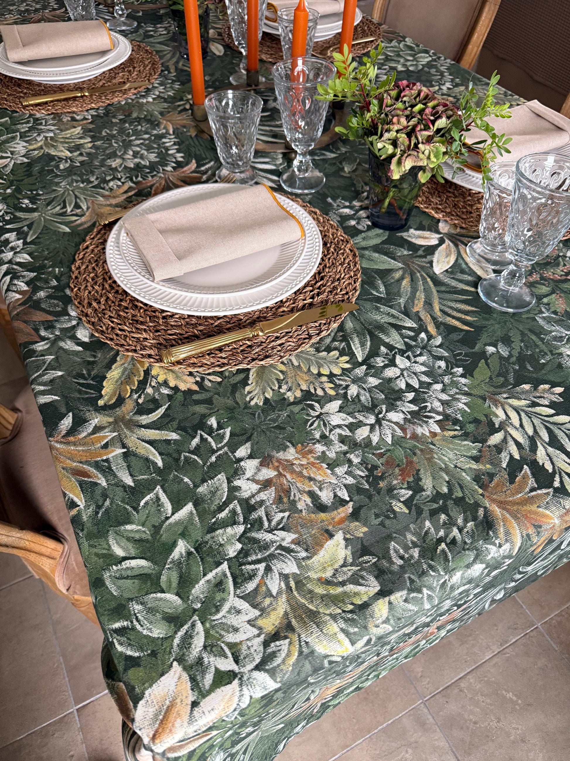 Ideal para Navidad y fiestas. Este mantel de algodón es perfecto para mesas grandes o pequeñas, cenas familiares, comidas con amigos o eventos festivos. Su diseño lleno de vegetación y matices naturales aporta un toque acogedor y sofisticado a cualquier mesa navideña.