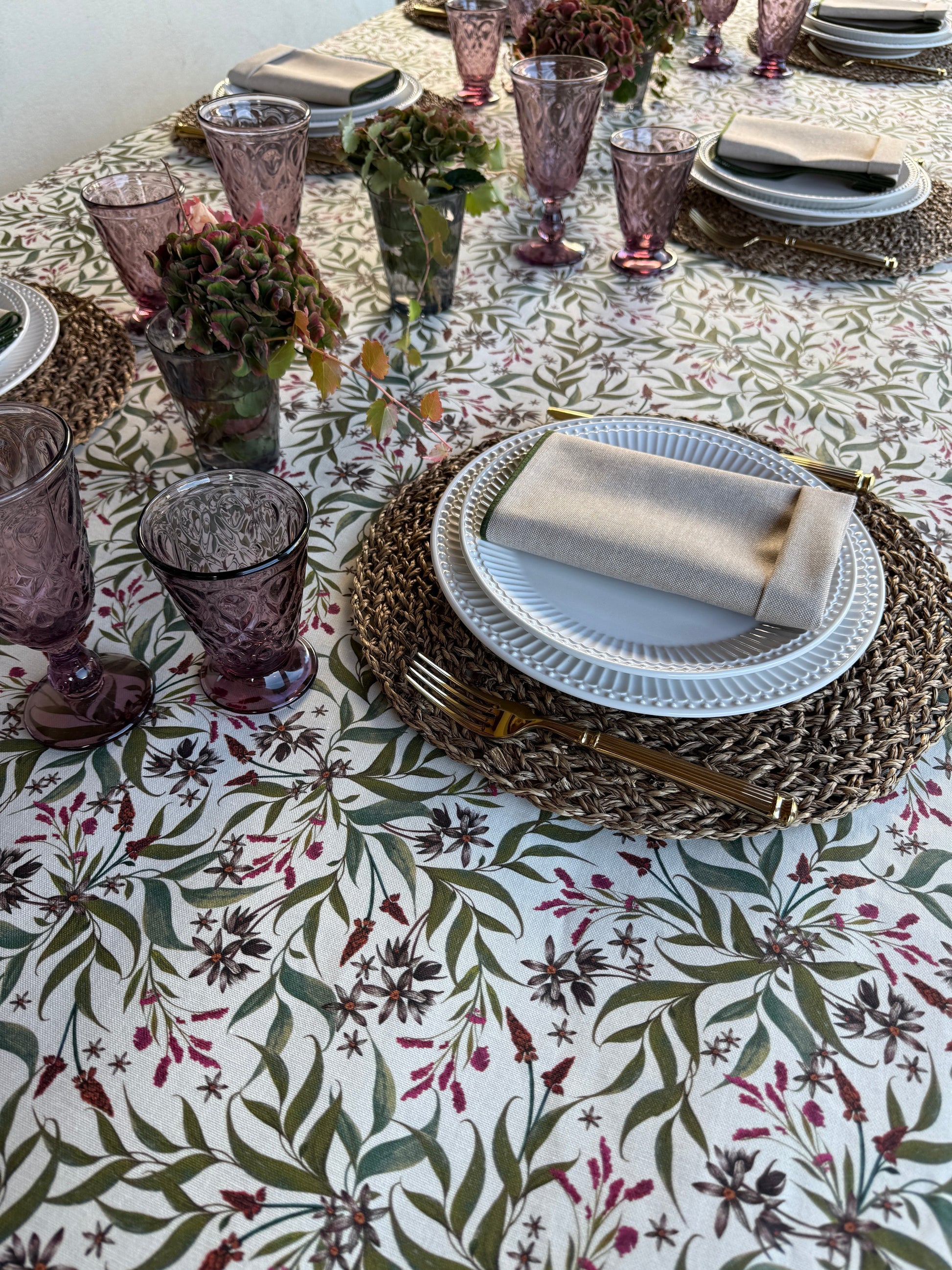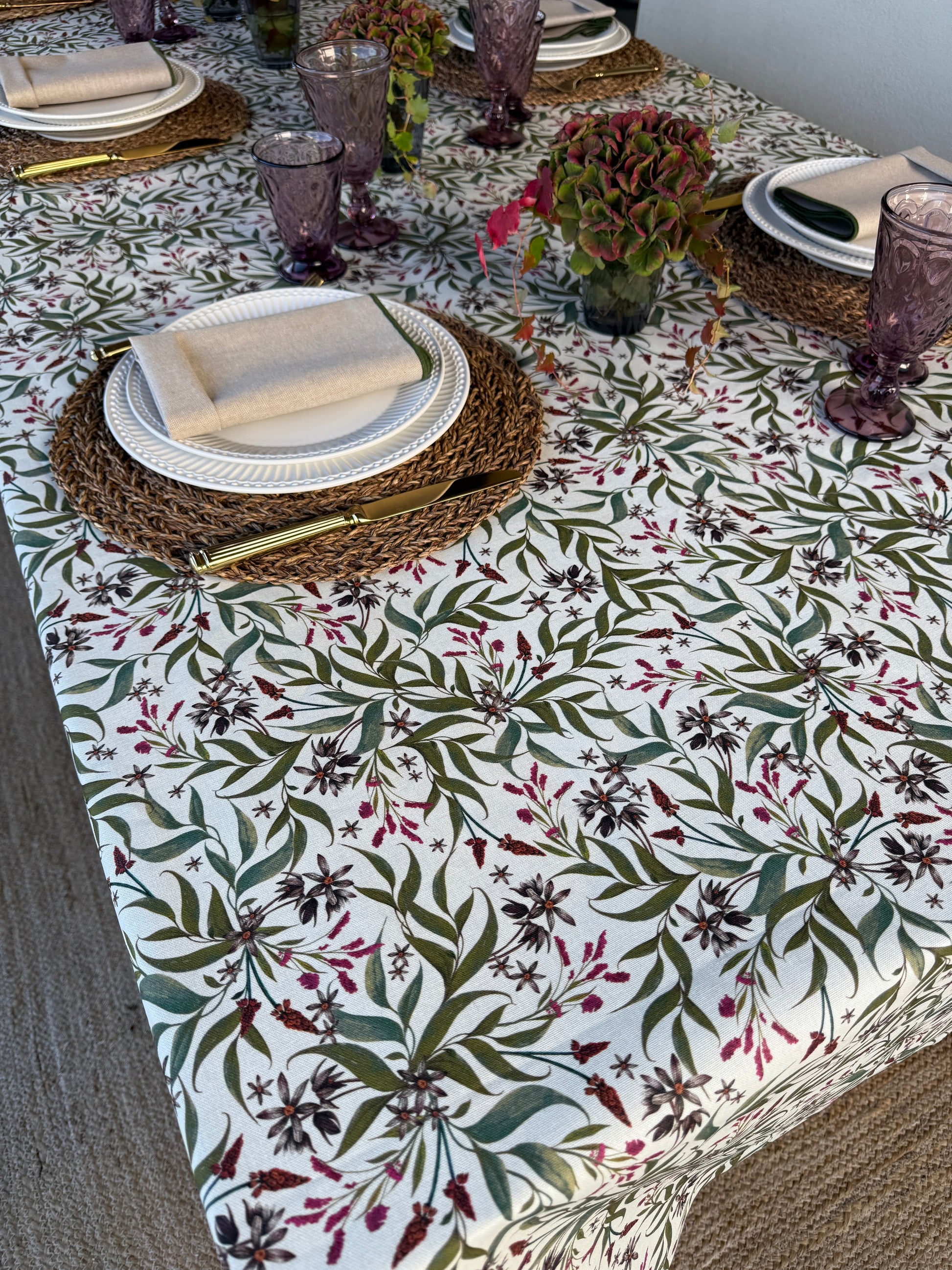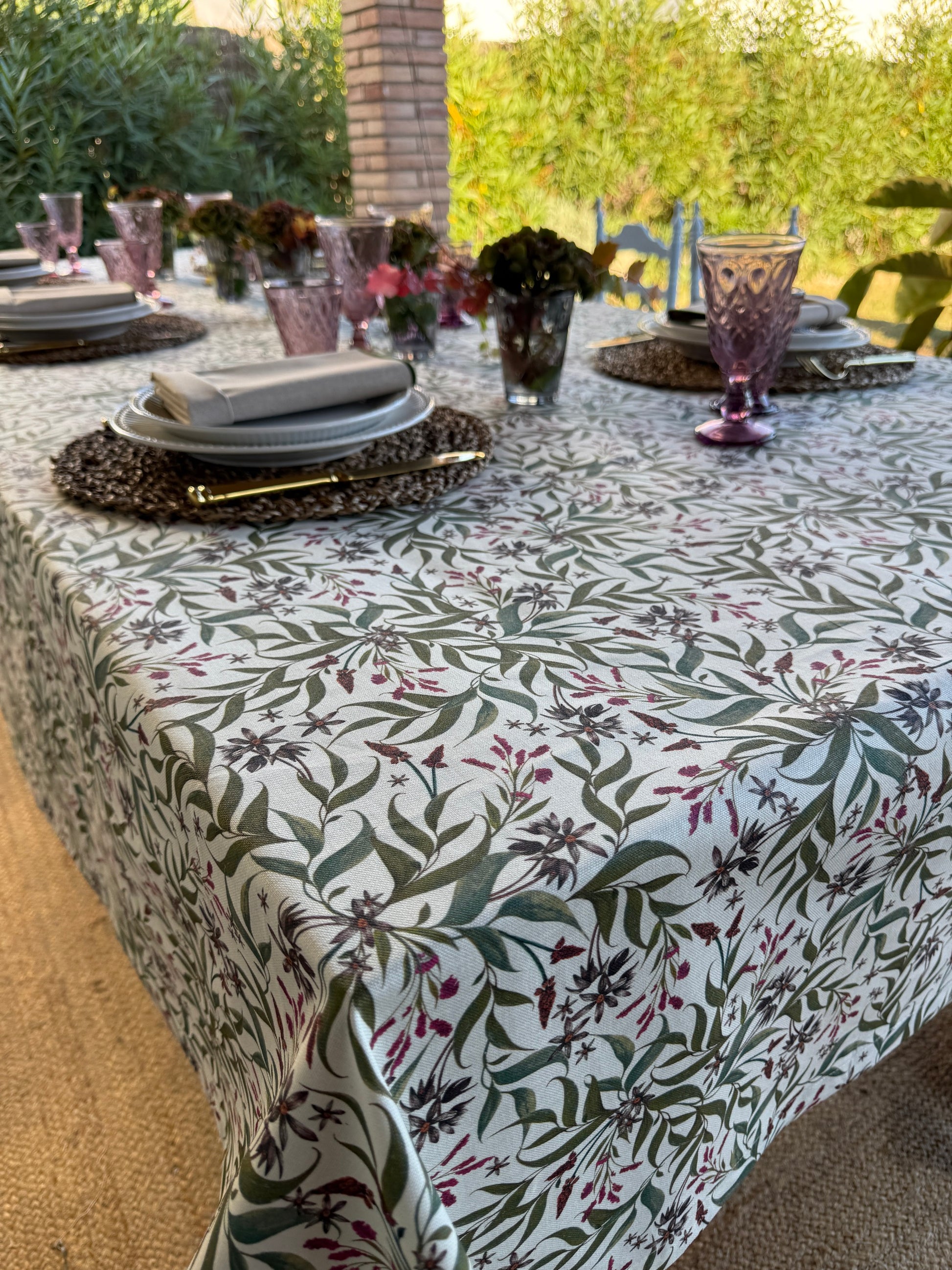 Lucía clara es un mantel de algodón orgánico con acabado resinado, que repele el agua y se limpia fácilmente con un paño húmedo. Su estampado vegetal en tonos verdes y detalles burdeos sobre fondo claro aporta frescura, luz y un aire mediterráneo a cualquier rincón.