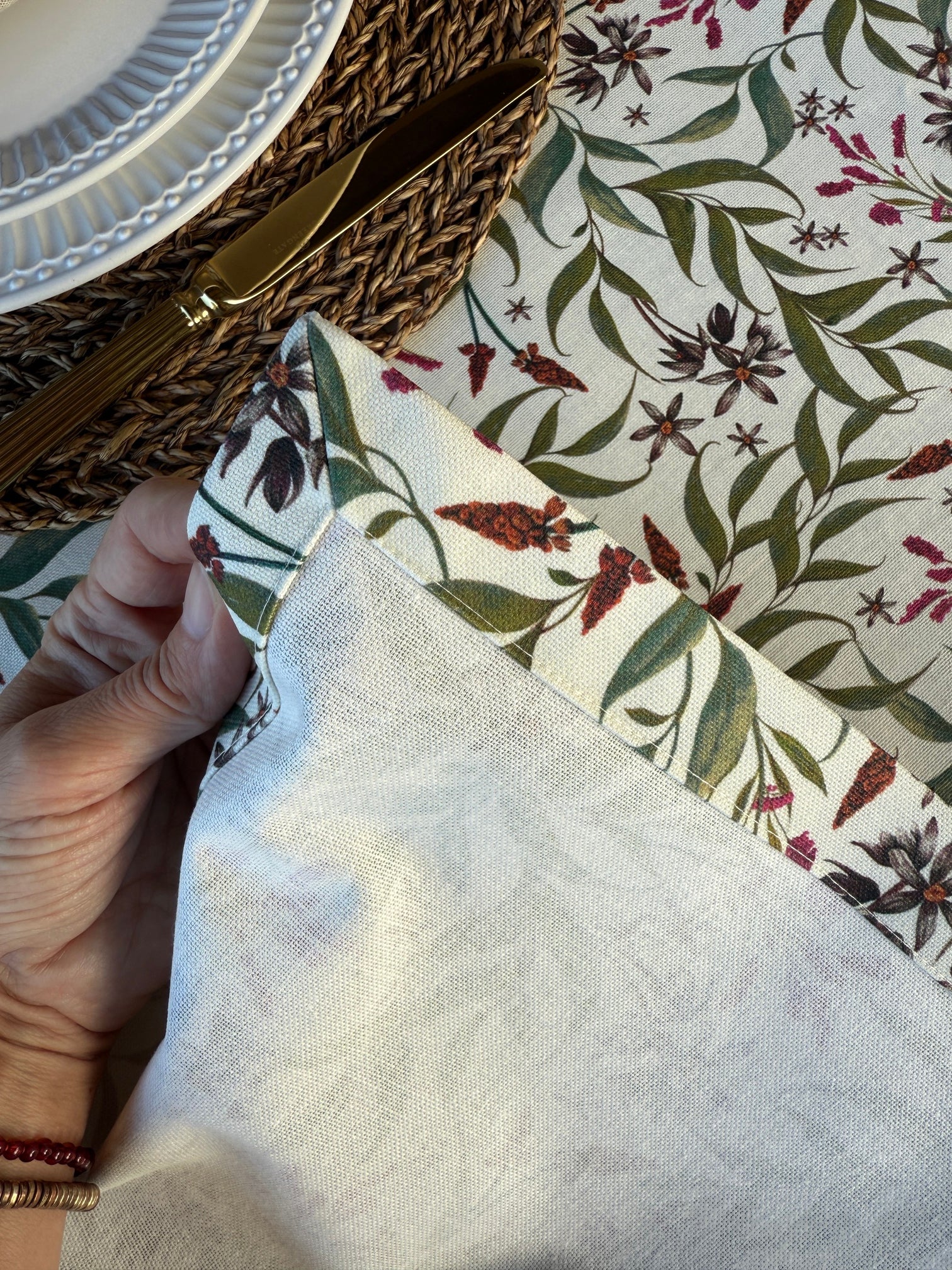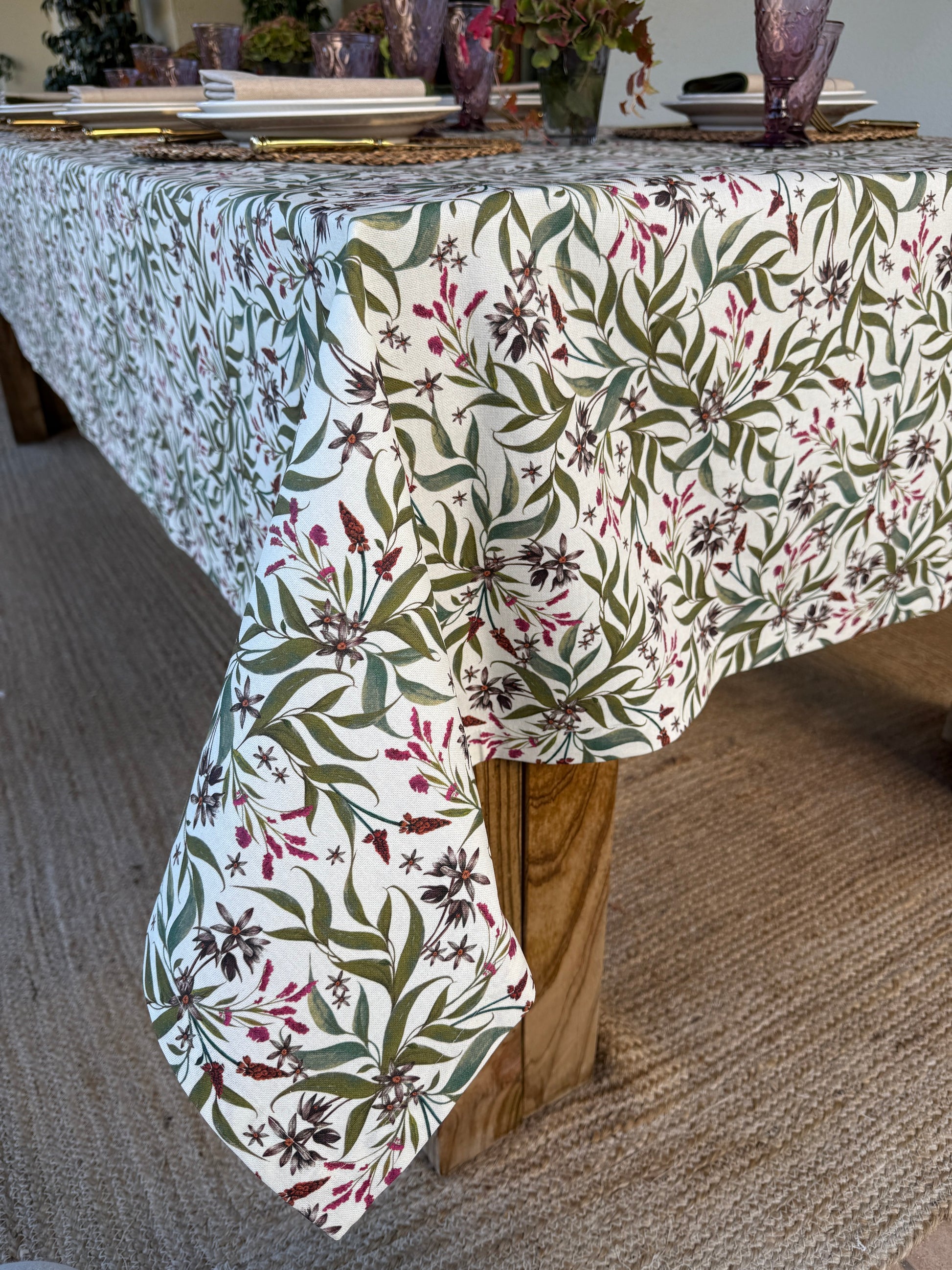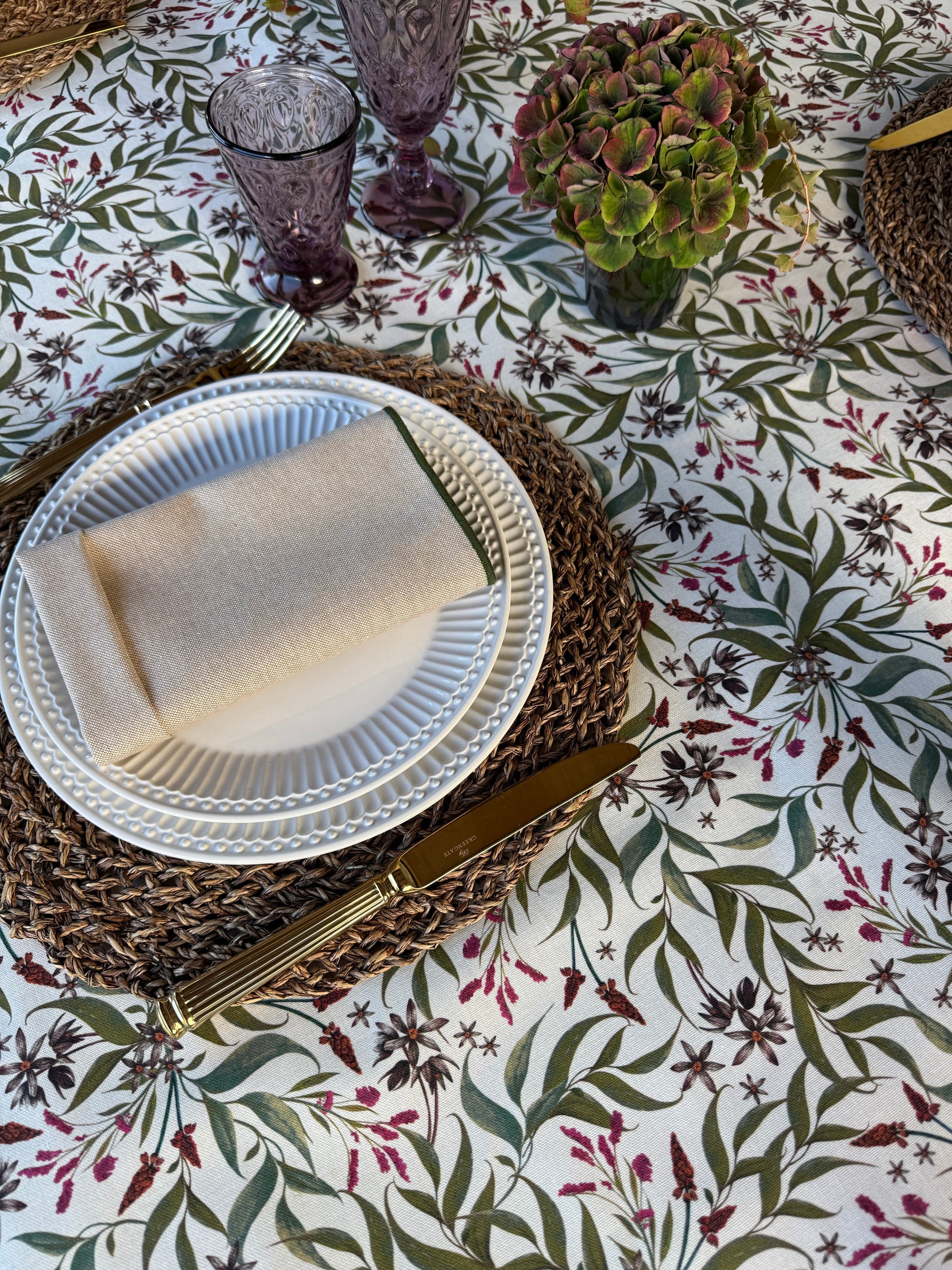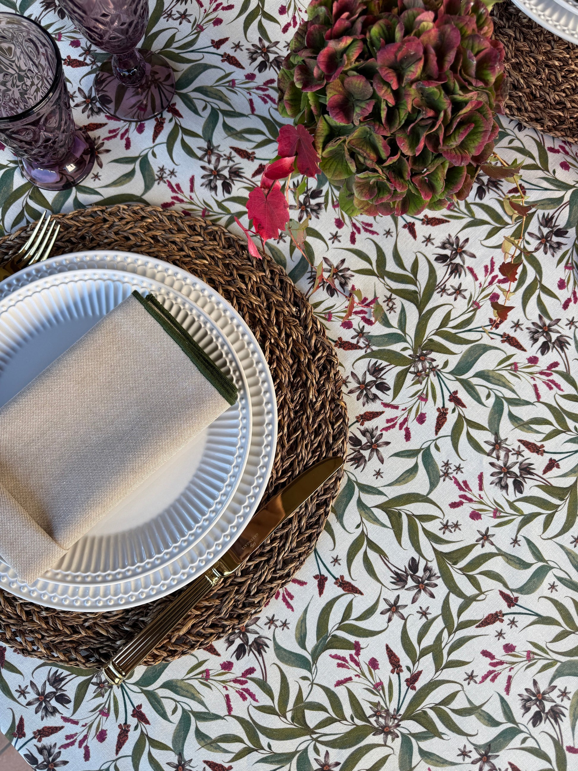 Lucía clara es un mantel de algodón orgánico con acabado resinado, que repele el agua y se limpia fácilmente con un paño húmedo. Su estampado vegetal en tonos verdes y detalles burdeos sobre fondo claro aporta frescura, luz y un aire mediterráneo a cualquier rincón.
