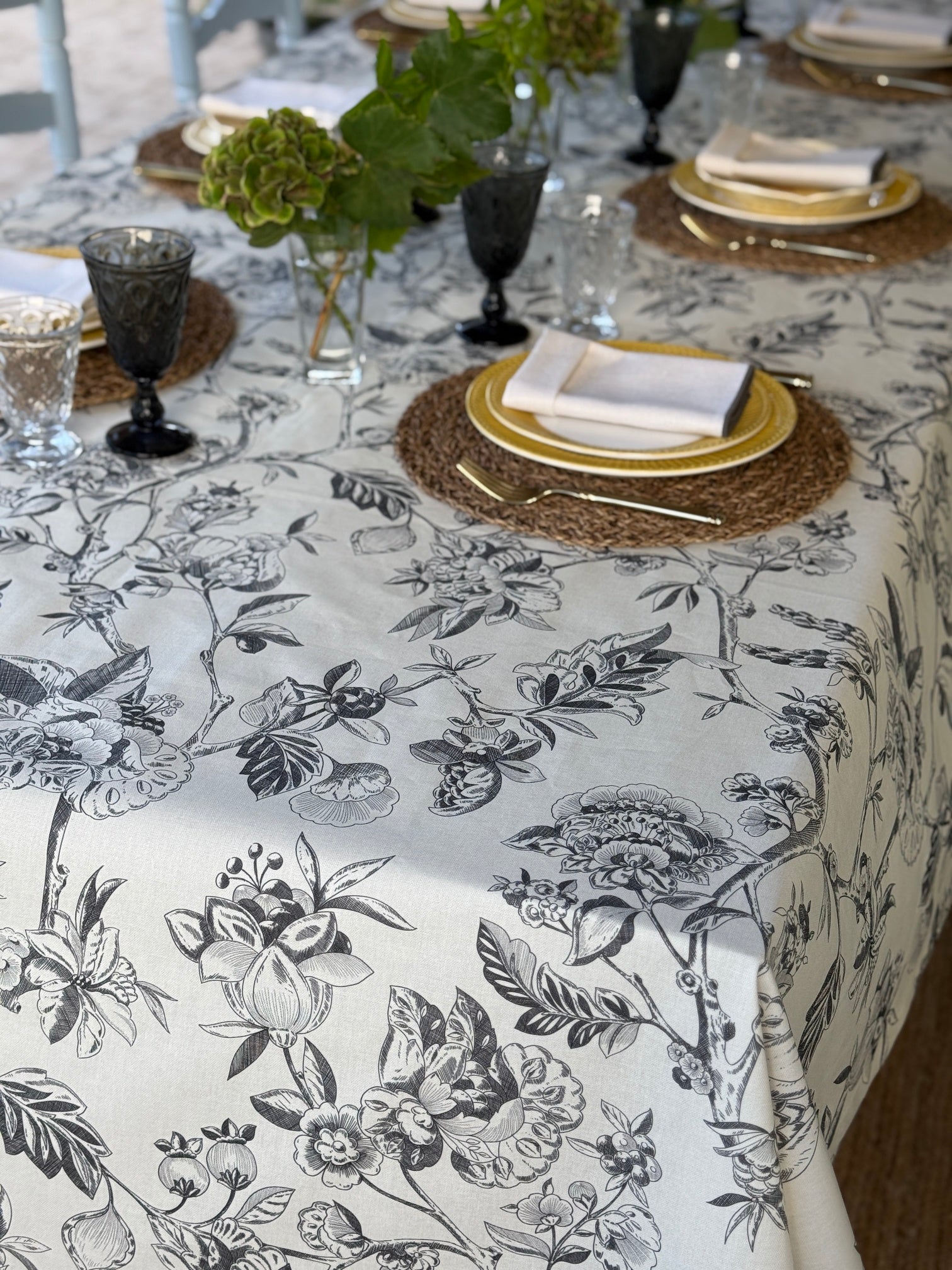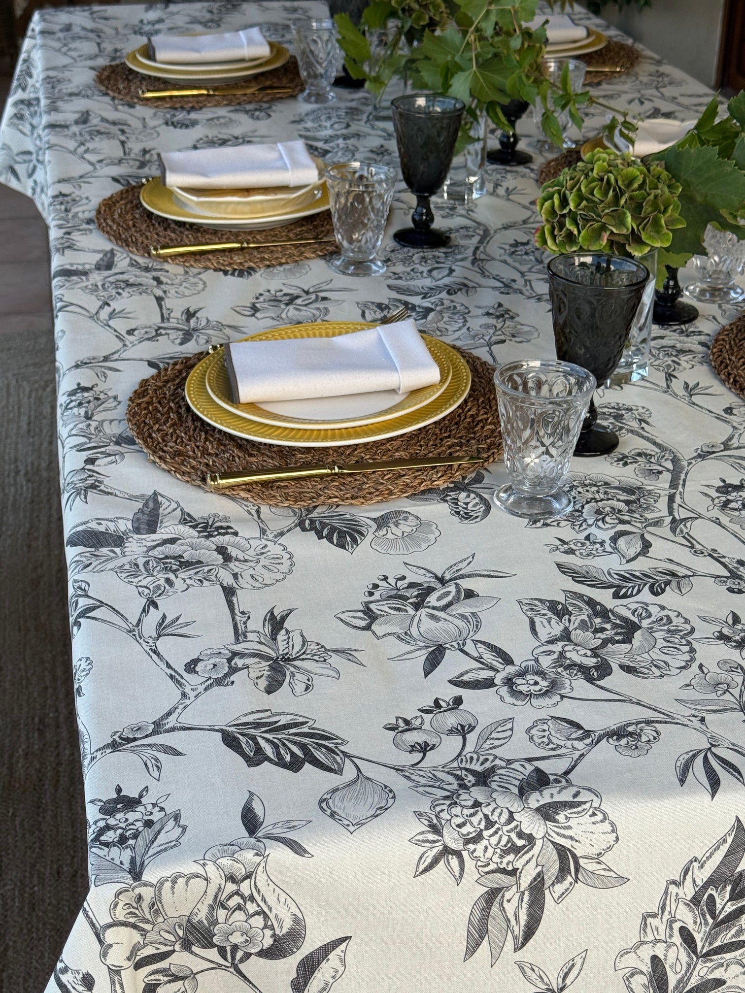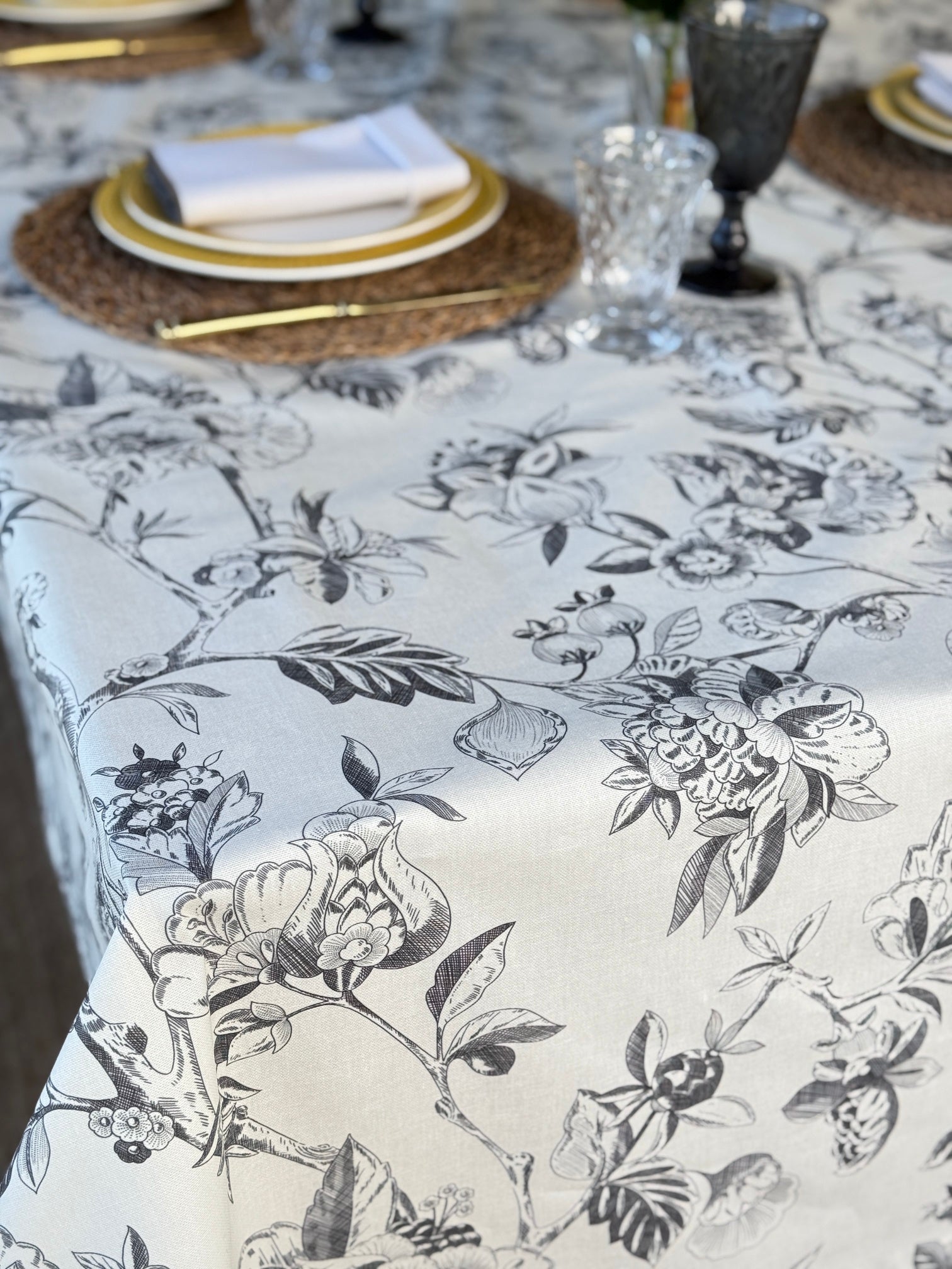 Serena gris es un mantel de algodón orgánico con acabado resinado, adornado con un delicado estampado floral en tonos grises oscuros sobre fondo marfil. Su diseño atemporal y elegante viste la mesa con un estilo sereno y versátil, perfecto para cualquier ocasión.