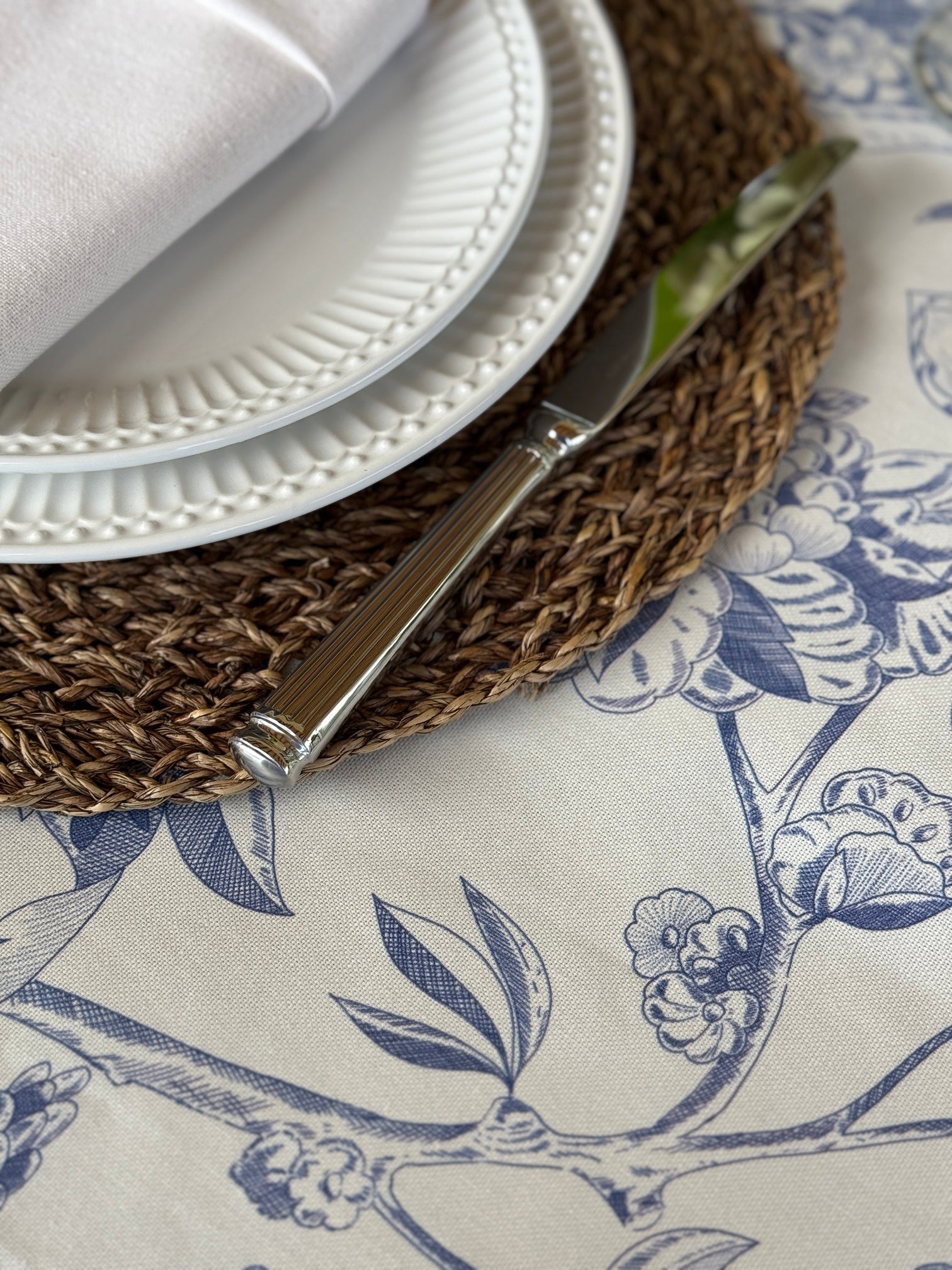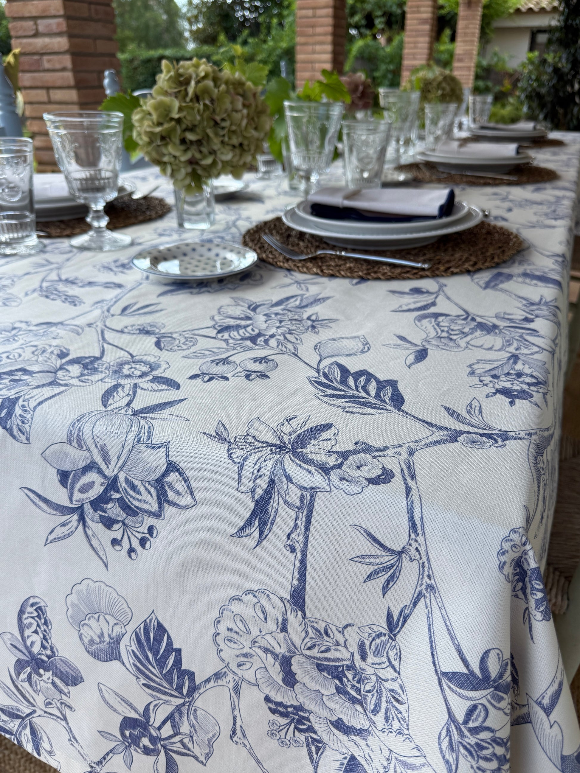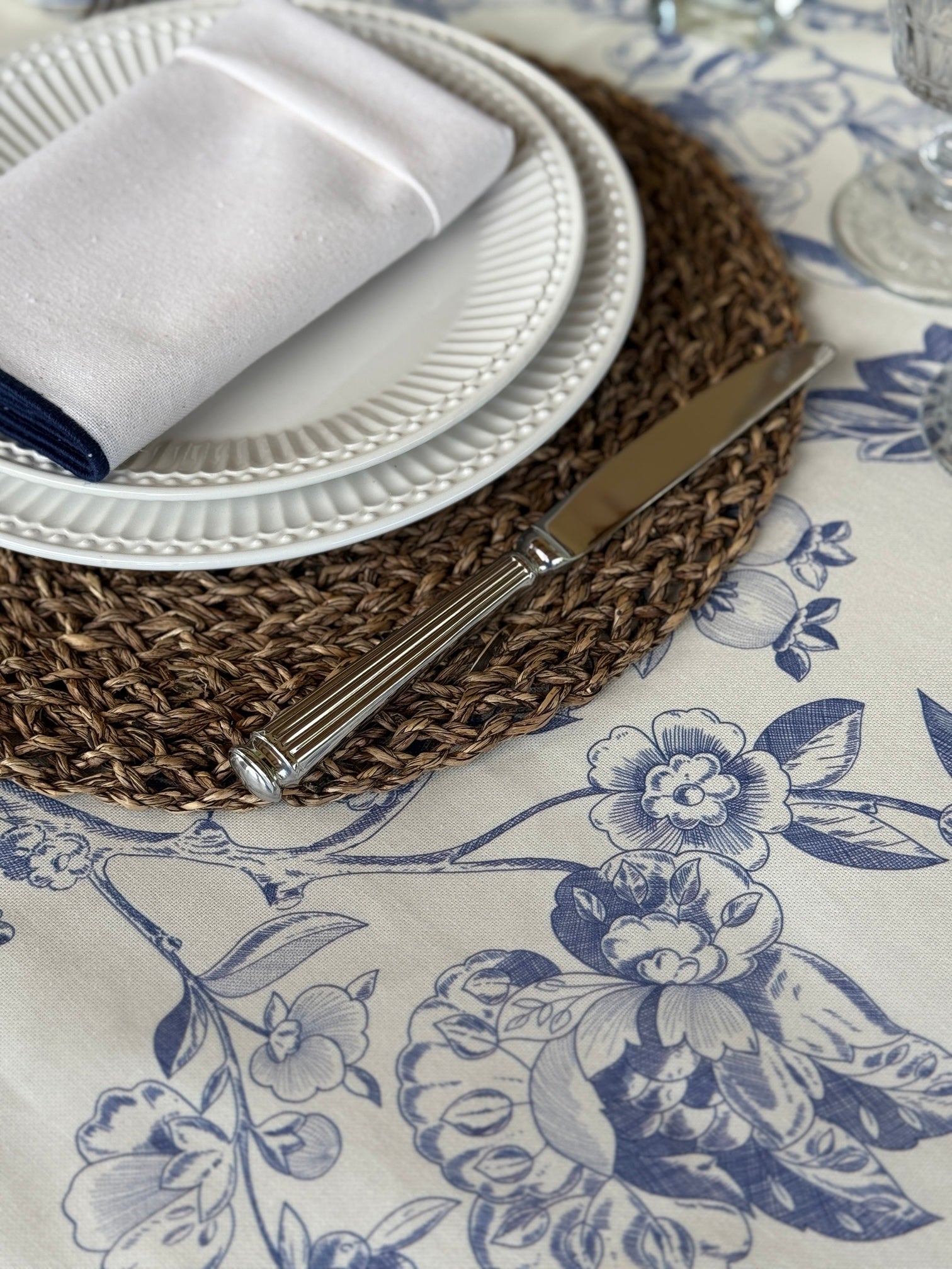 Serena es un mantel de algodón con estampado botánico en azul profundo sobre fondo natural. Clásico y fresco a la vez, este diseño convierte cualquier comida en un momento especial.