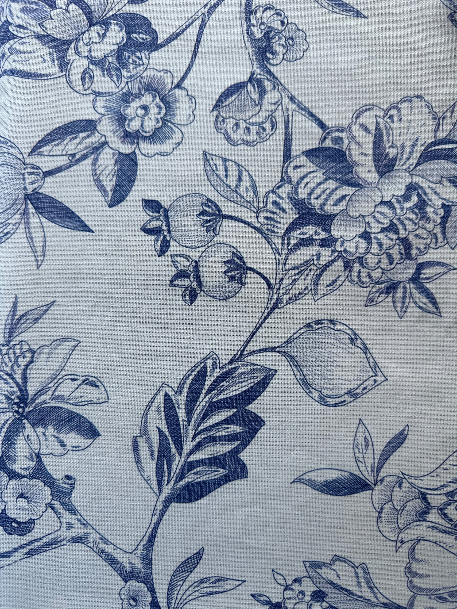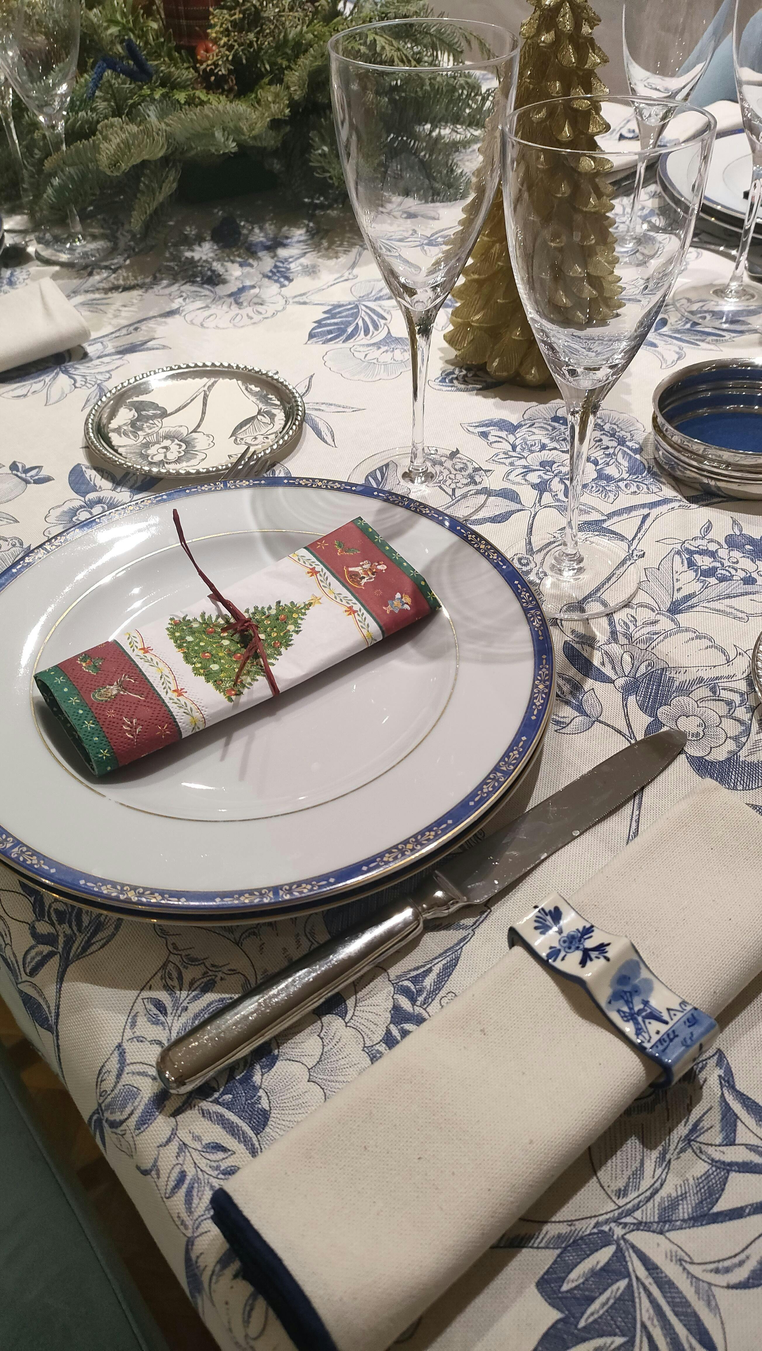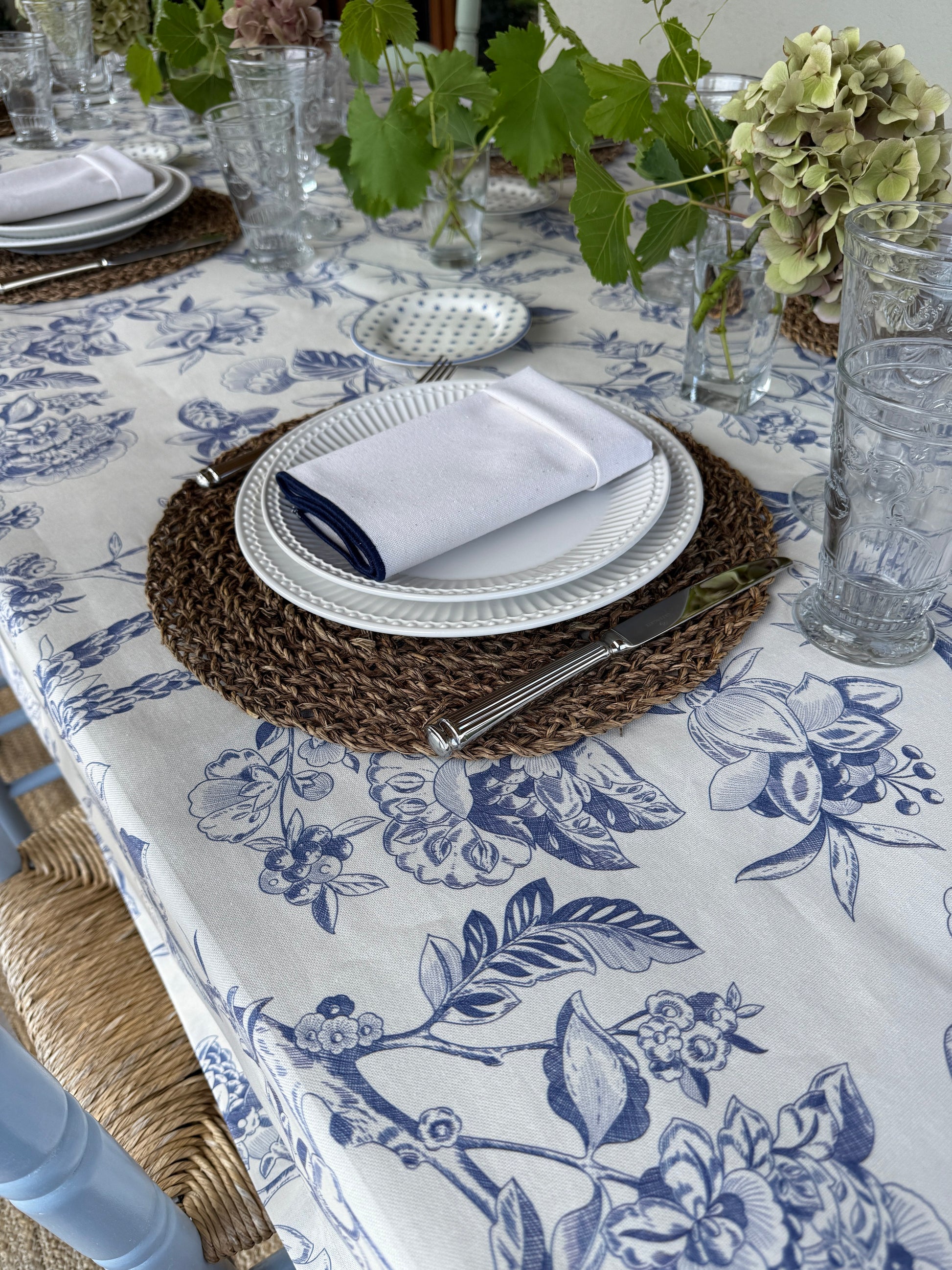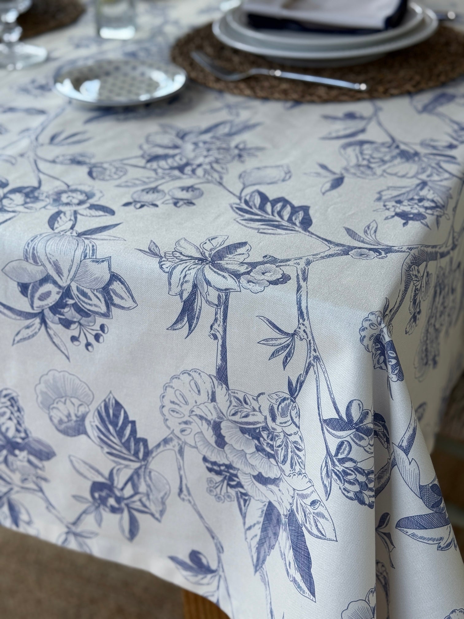Serena es un mantel de algodón con estampado botánico en azul profundo sobre fondo natural. Clásico y fresco a la vez, este diseño convierte cualquier comida en un momento especial.