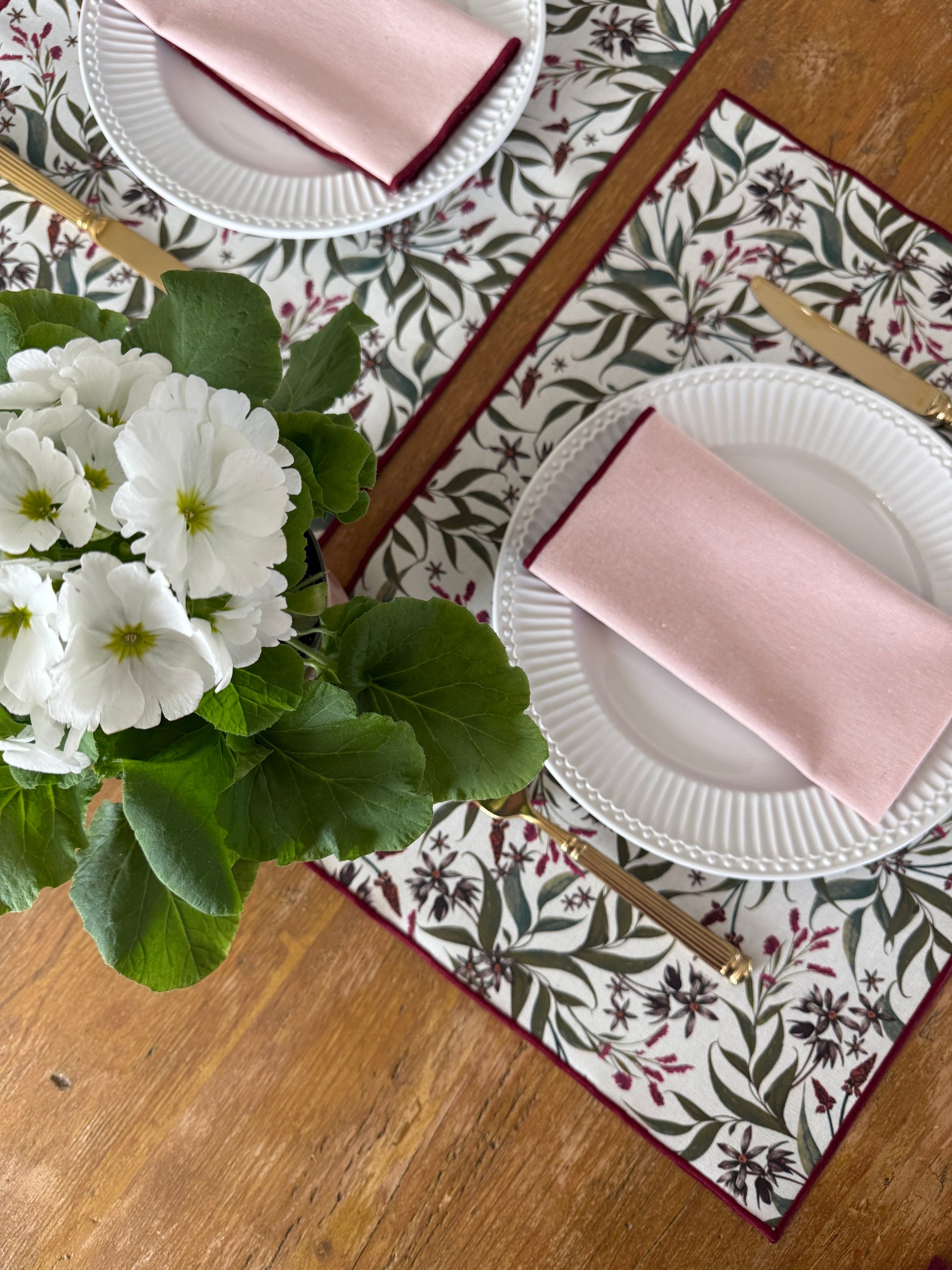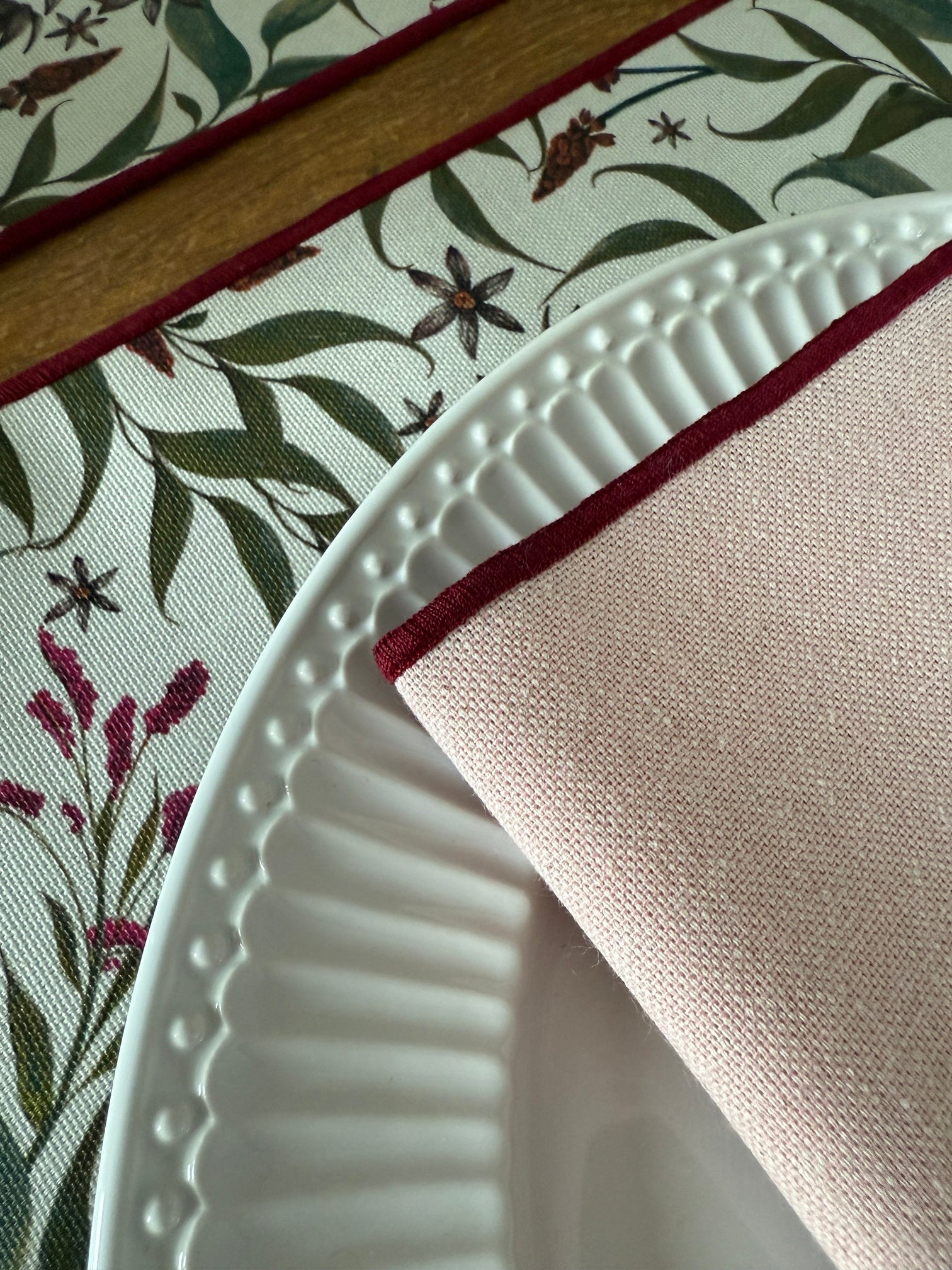 El diseño Lucía tiene un estampado floral delicado en tonos verdes y granate sobre un fondo claro. Un diseño sereno y atemporal, pensado para vestir la mesa a diario con armonía y calidez.