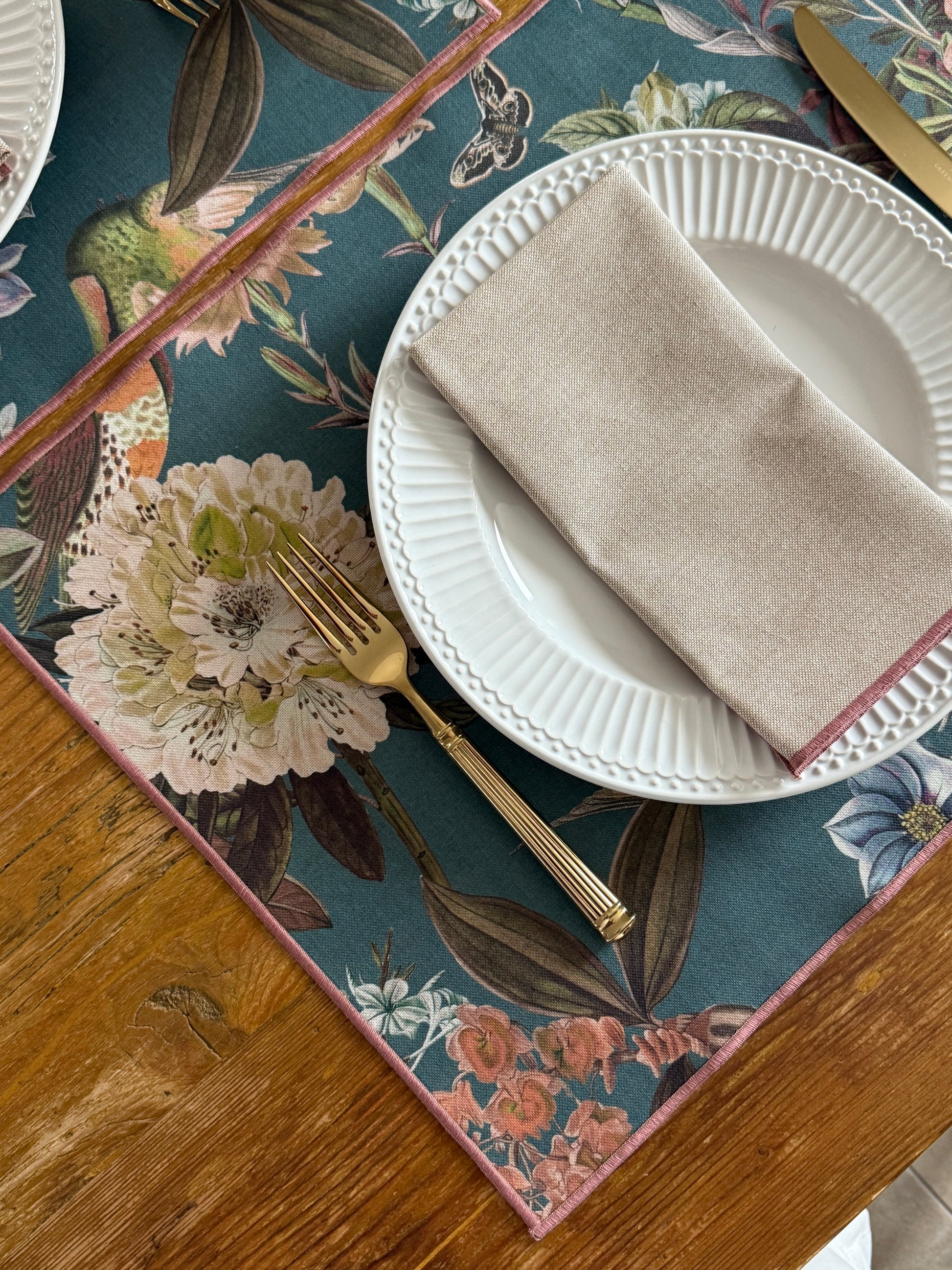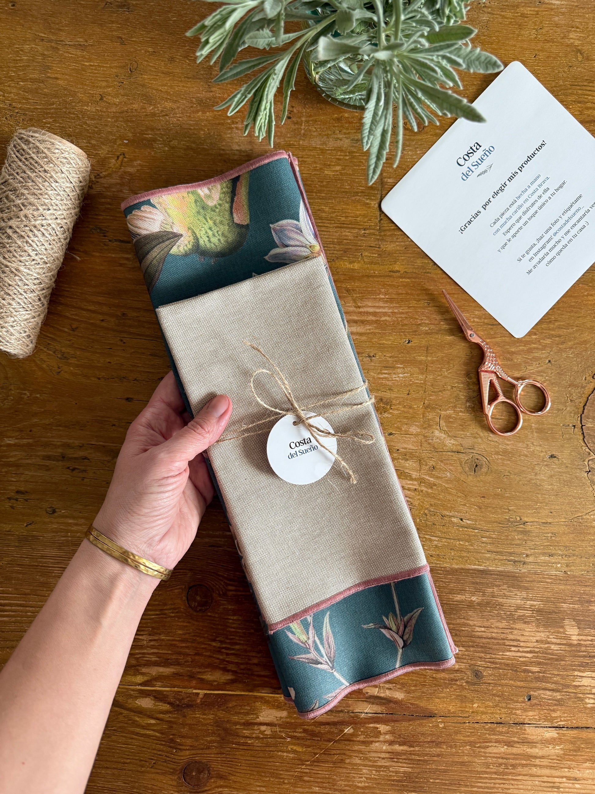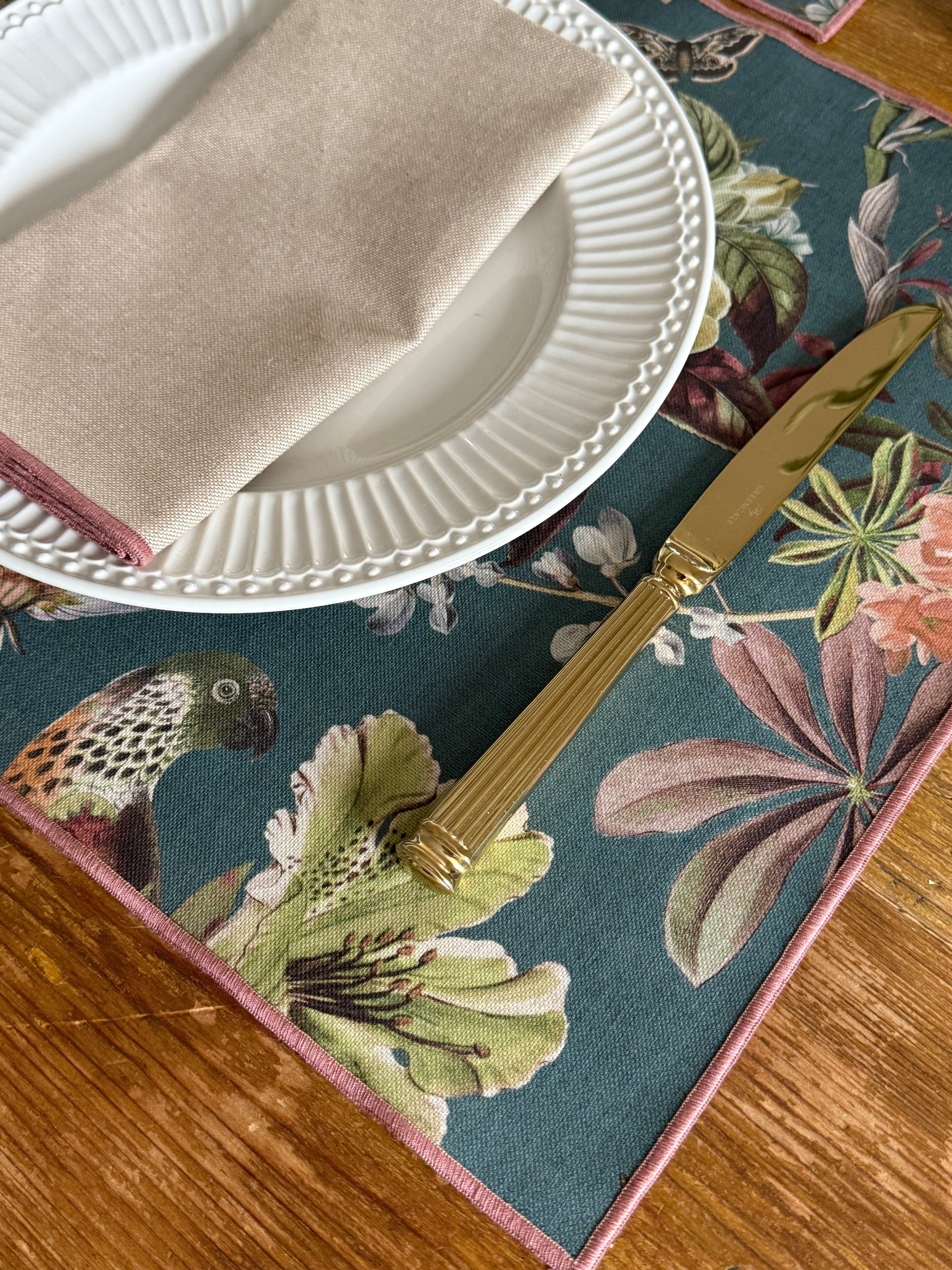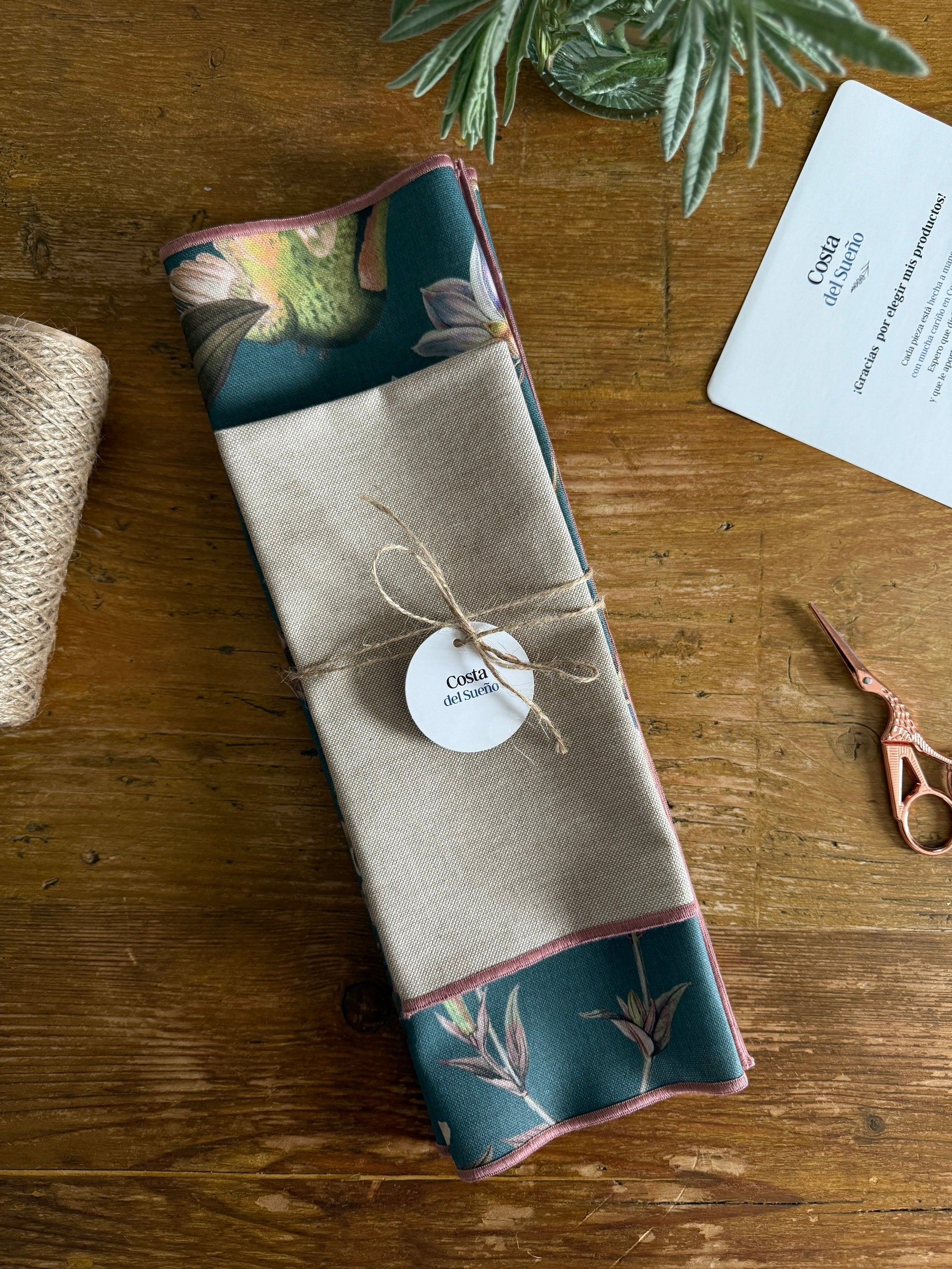 El diseño Naira combina un fondo verde azulado con estampado botánico de flores y pájaros. Es de esos estampados que visten la mesa sin pedir nada más: un café rápido, un desayuno lento o una cena improvisada.