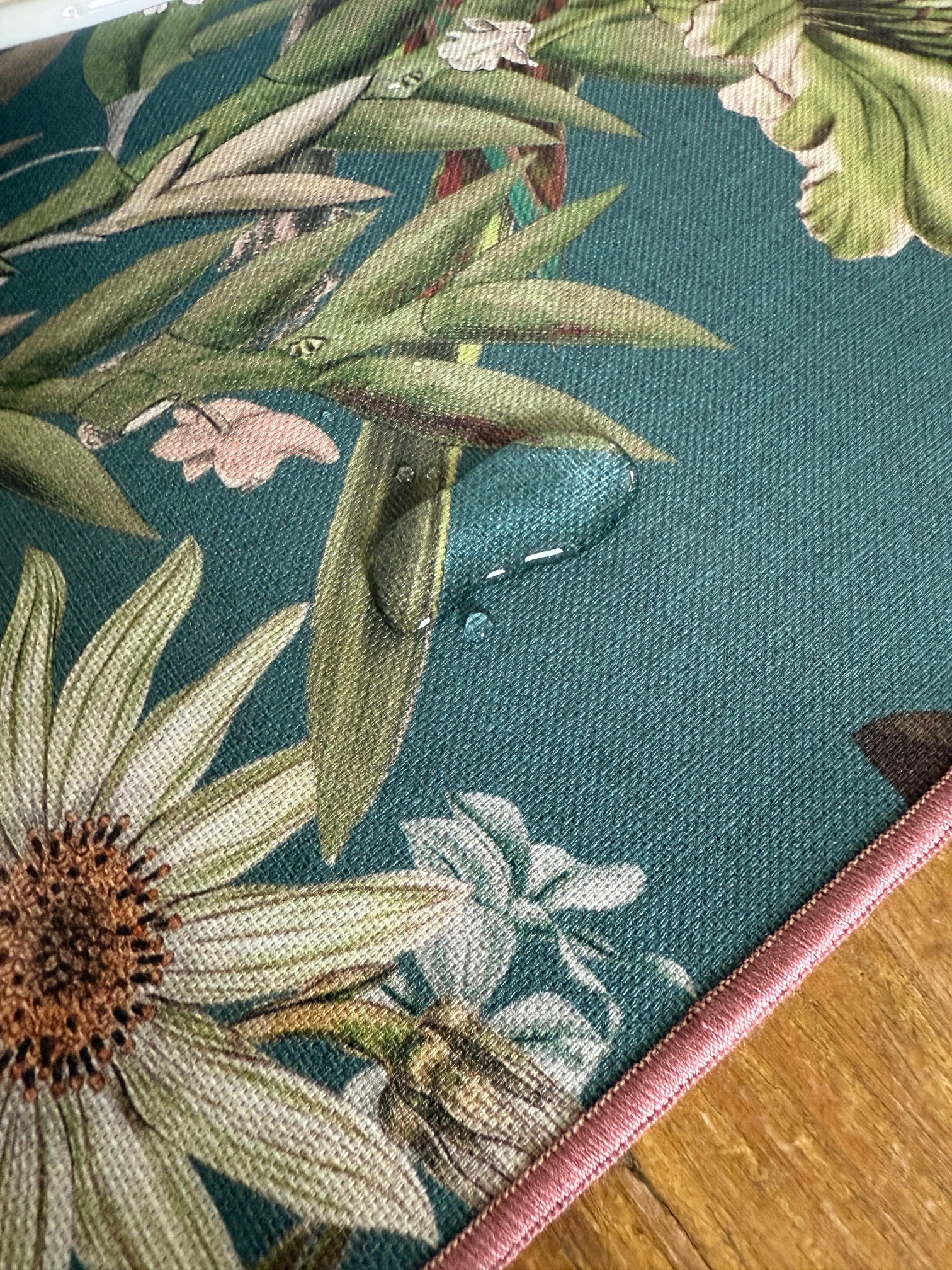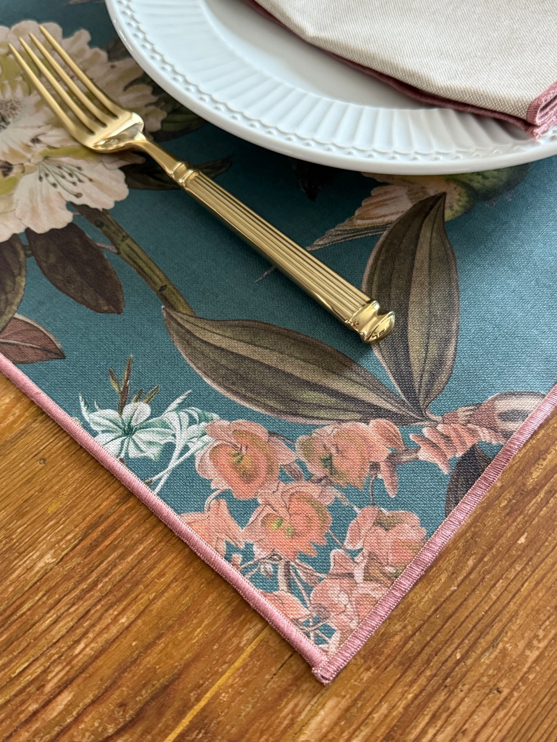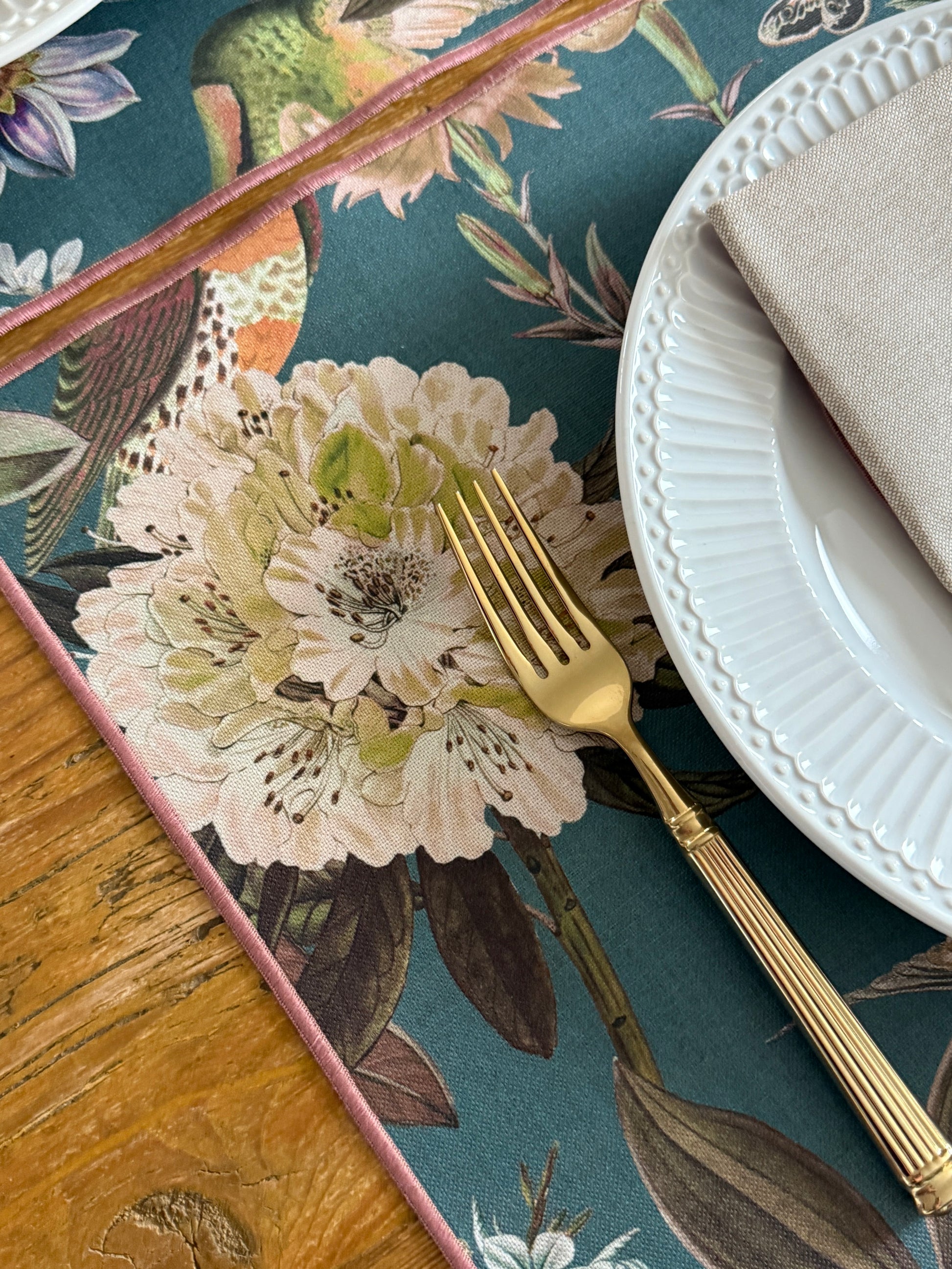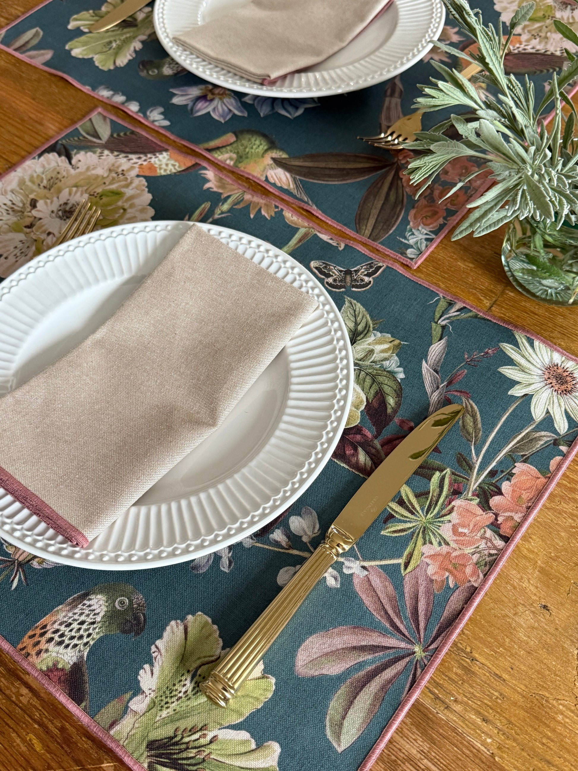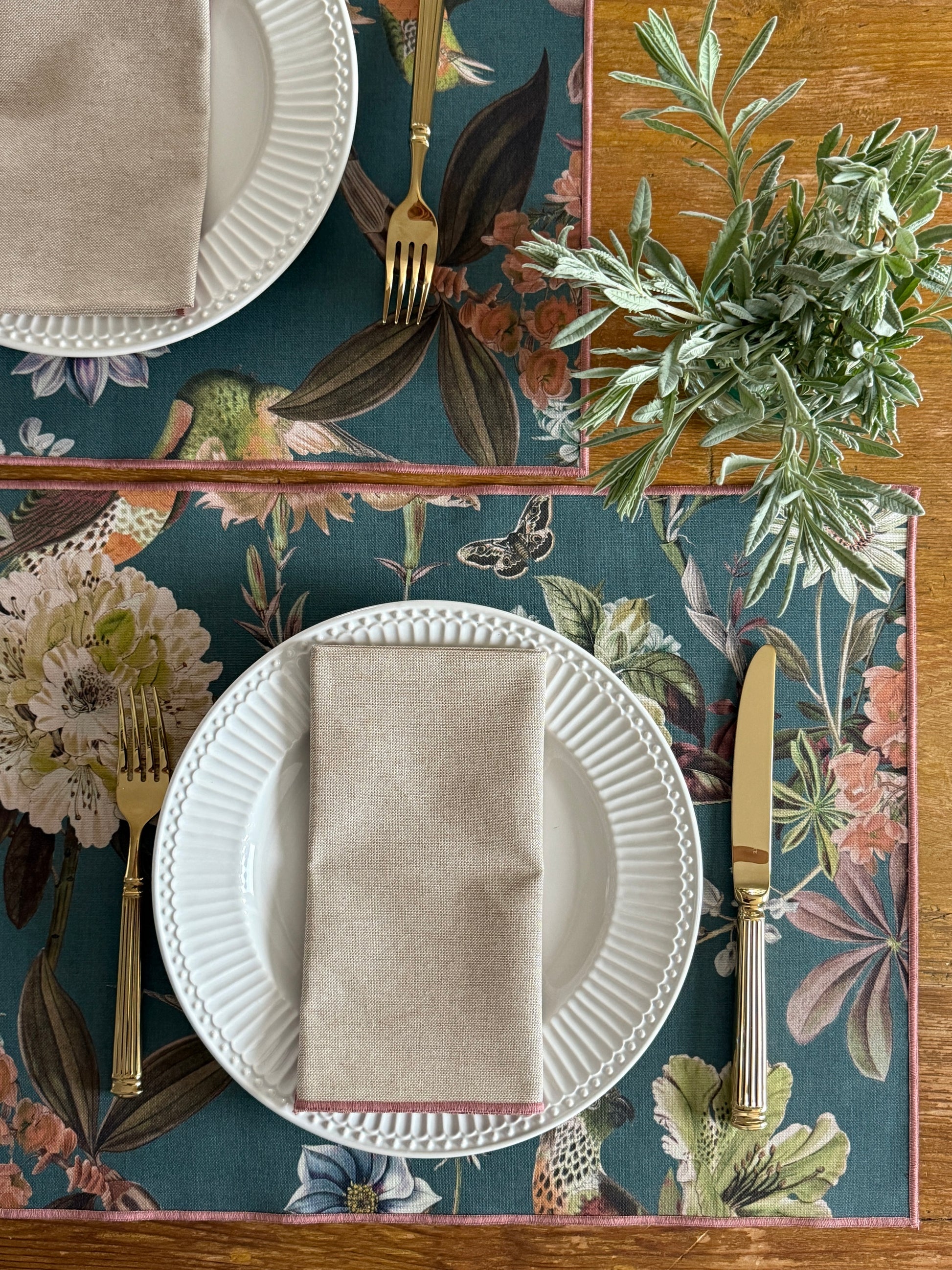 El diseño Naira combina un fondo verde azulado con estampado botánico de flores y pájaros. Es de esos estampados que visten la mesa sin pedir nada más: un café rápido, un desayuno lento o una cena improvisada.