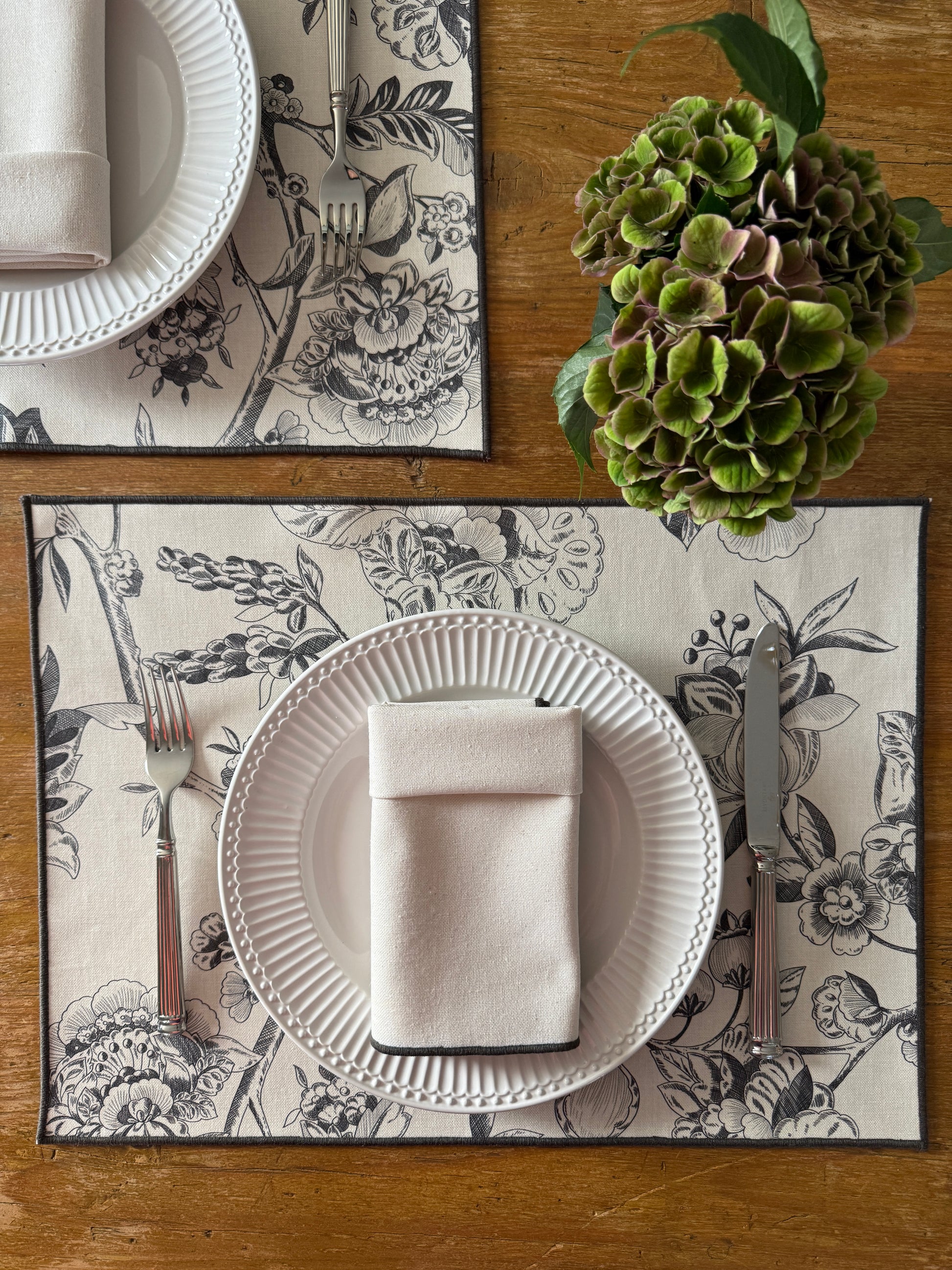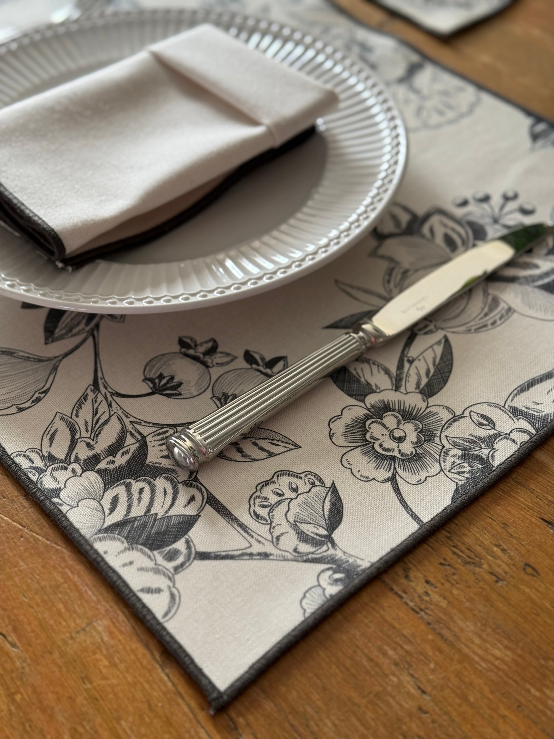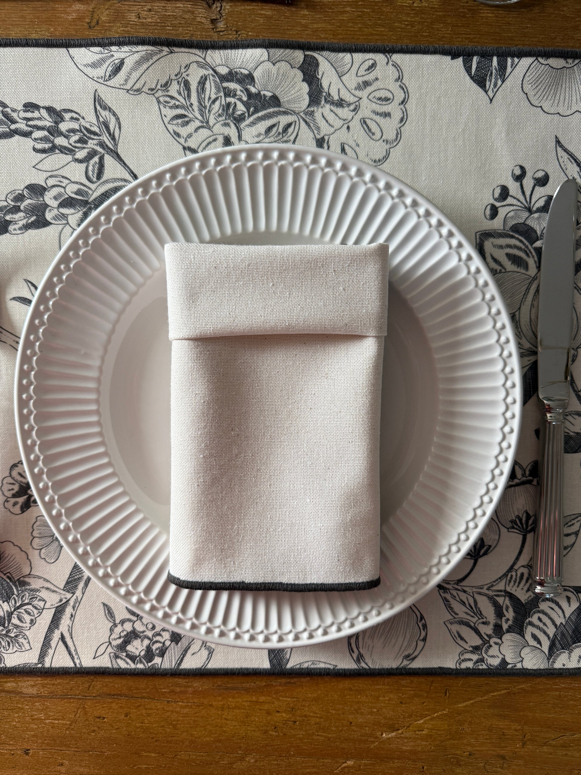 Pack de temporada con individuales resinados y servilletas de algodón con ribete gris oscuro.