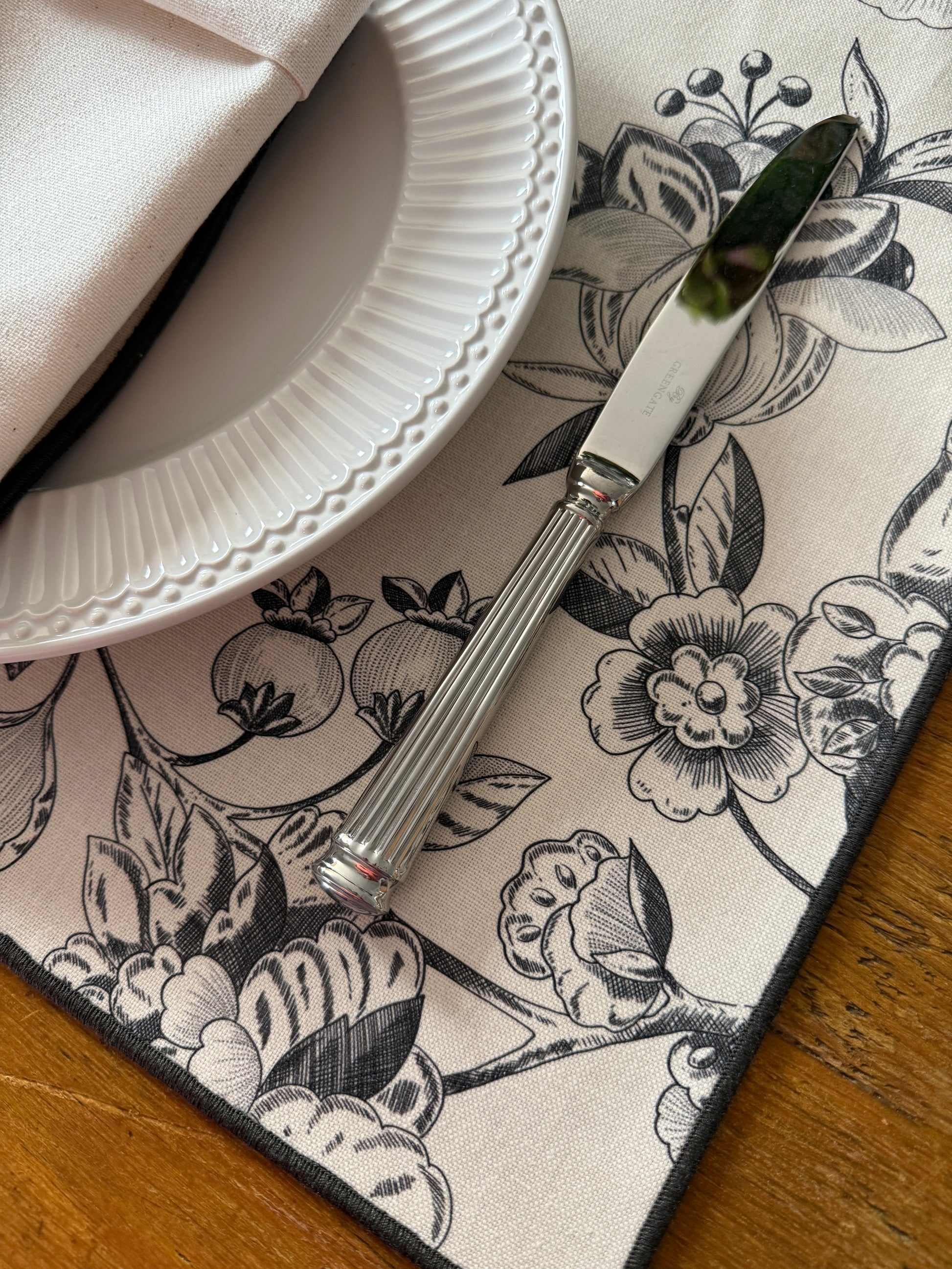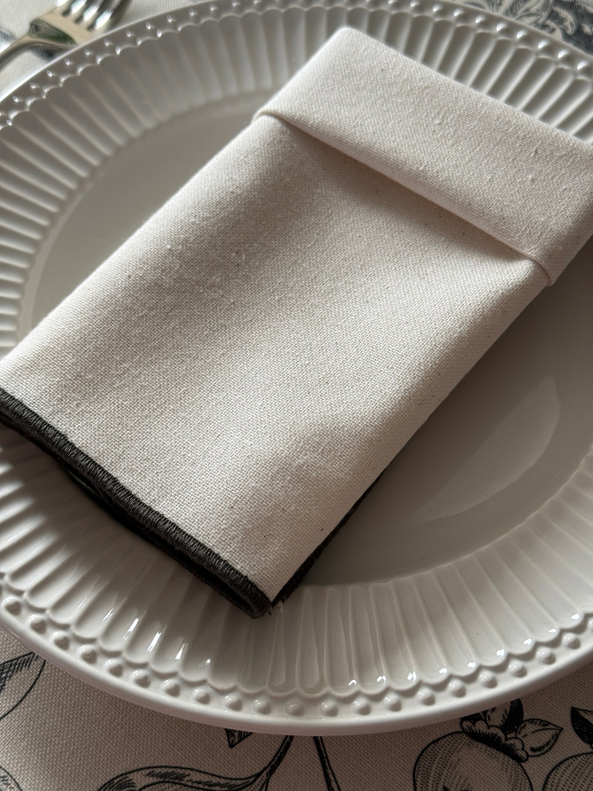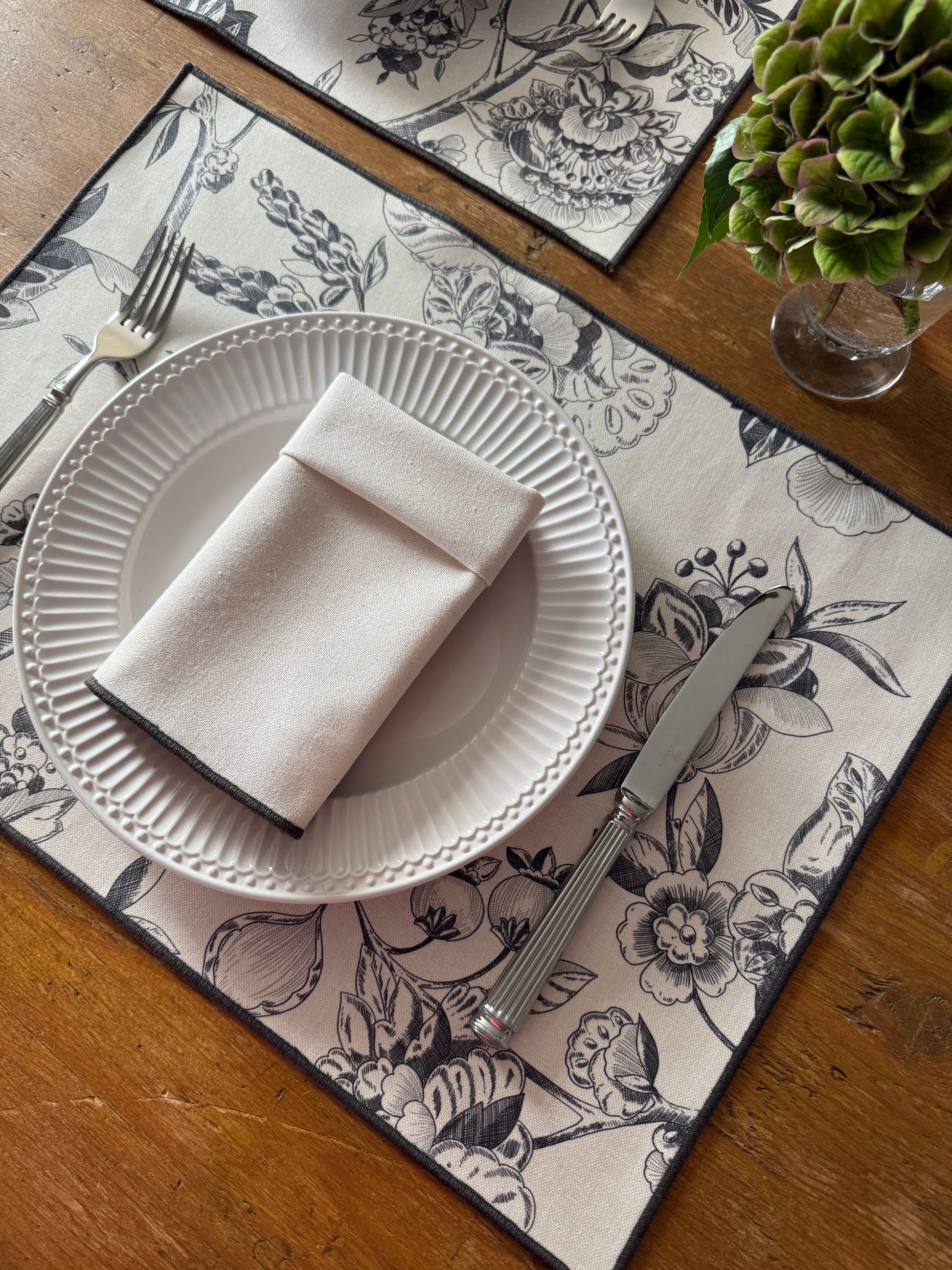 Pack de temporada con individuales resinados y servilletas de algodón con ribete gris oscuro.
