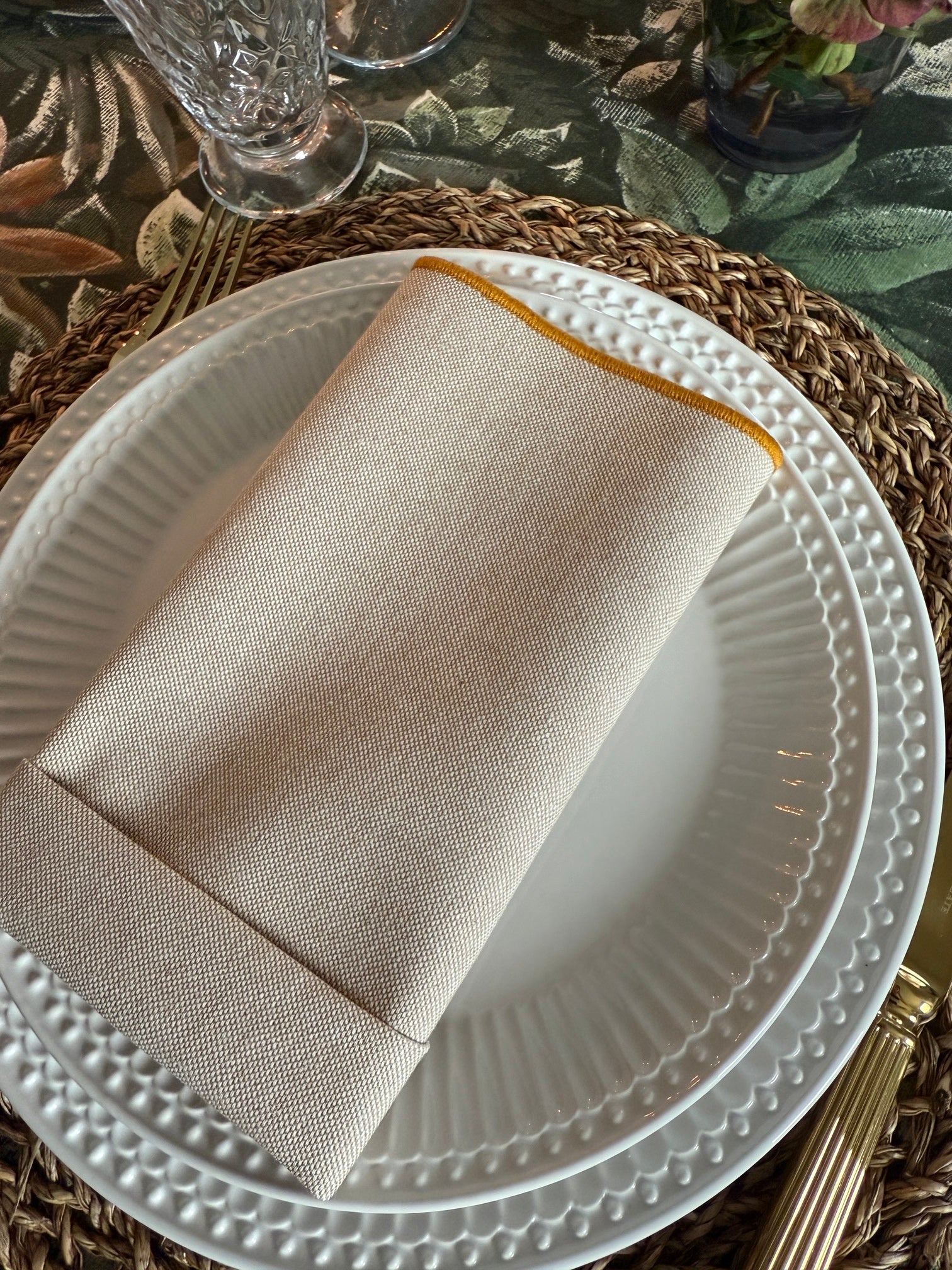 Estas servilletas de algodón en tono beige, rematadas con un ribete mostaza, aportan elegancia sencilla a cualquier mesa.
